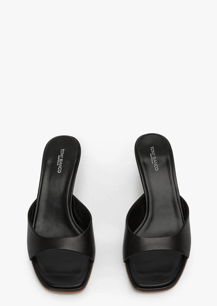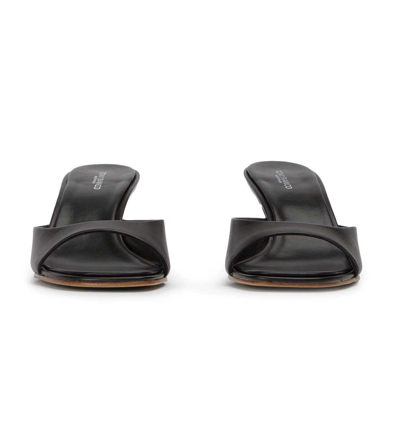 Simplistic and essential is the Aja mule. Crafted from our signatory black leather, this low heel is the perfect choice for the girl on the go. Features an open square toe shape and slender upper vamp.