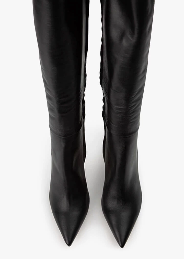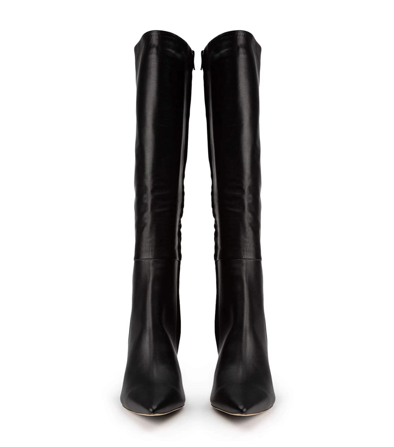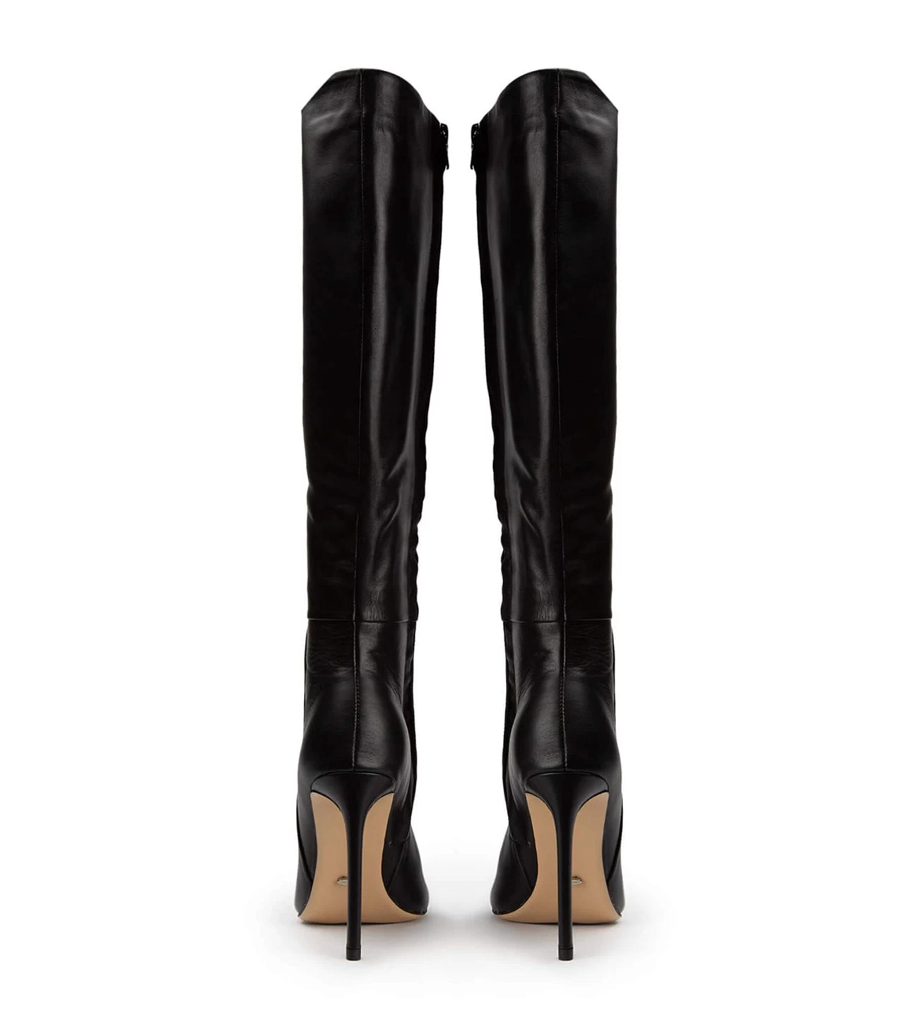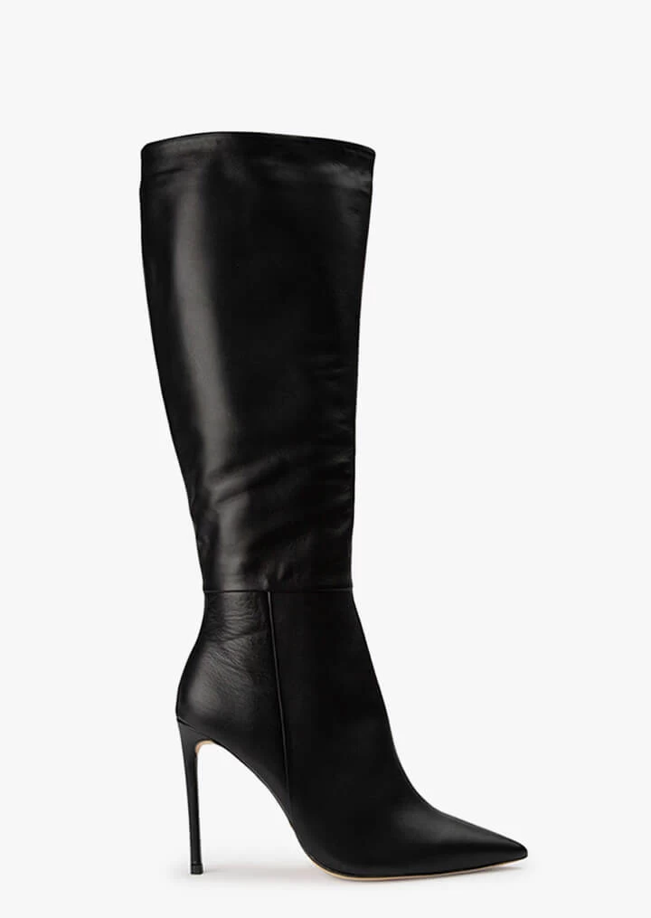 Keep it extra chic with the classic Apollo black leather knee-high boots. Featuring an elongated pointed toe design, a high stiletto heel and a full length zip, this calf boot transcends trends and remains a timeless staple.