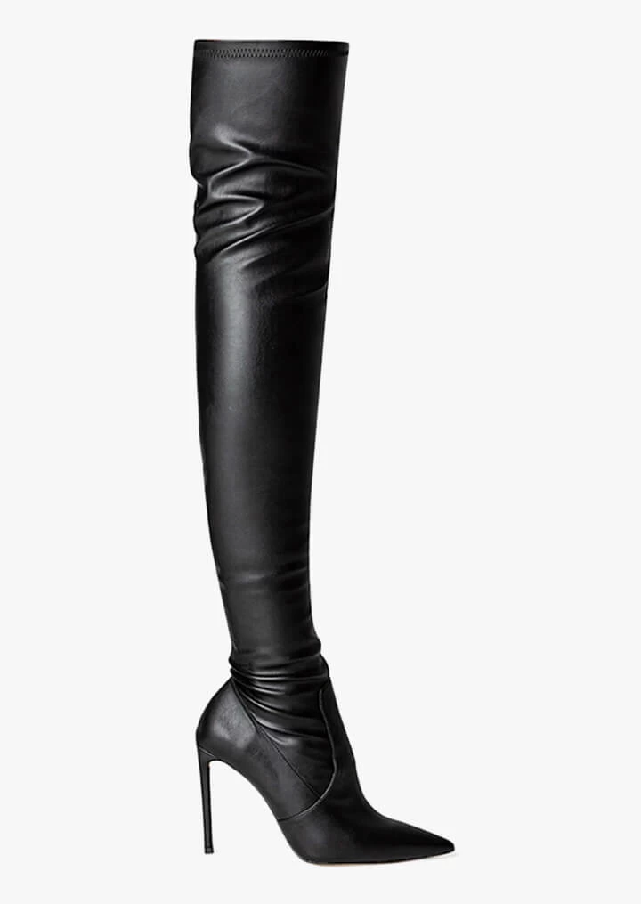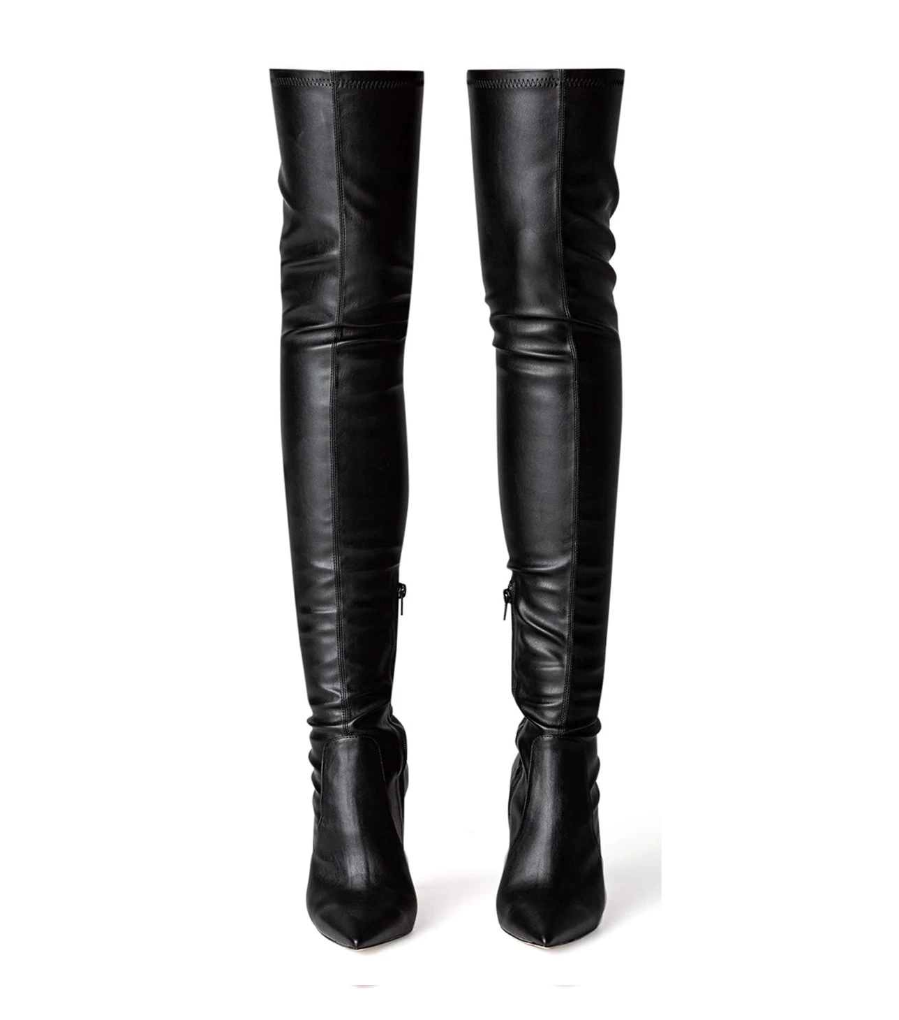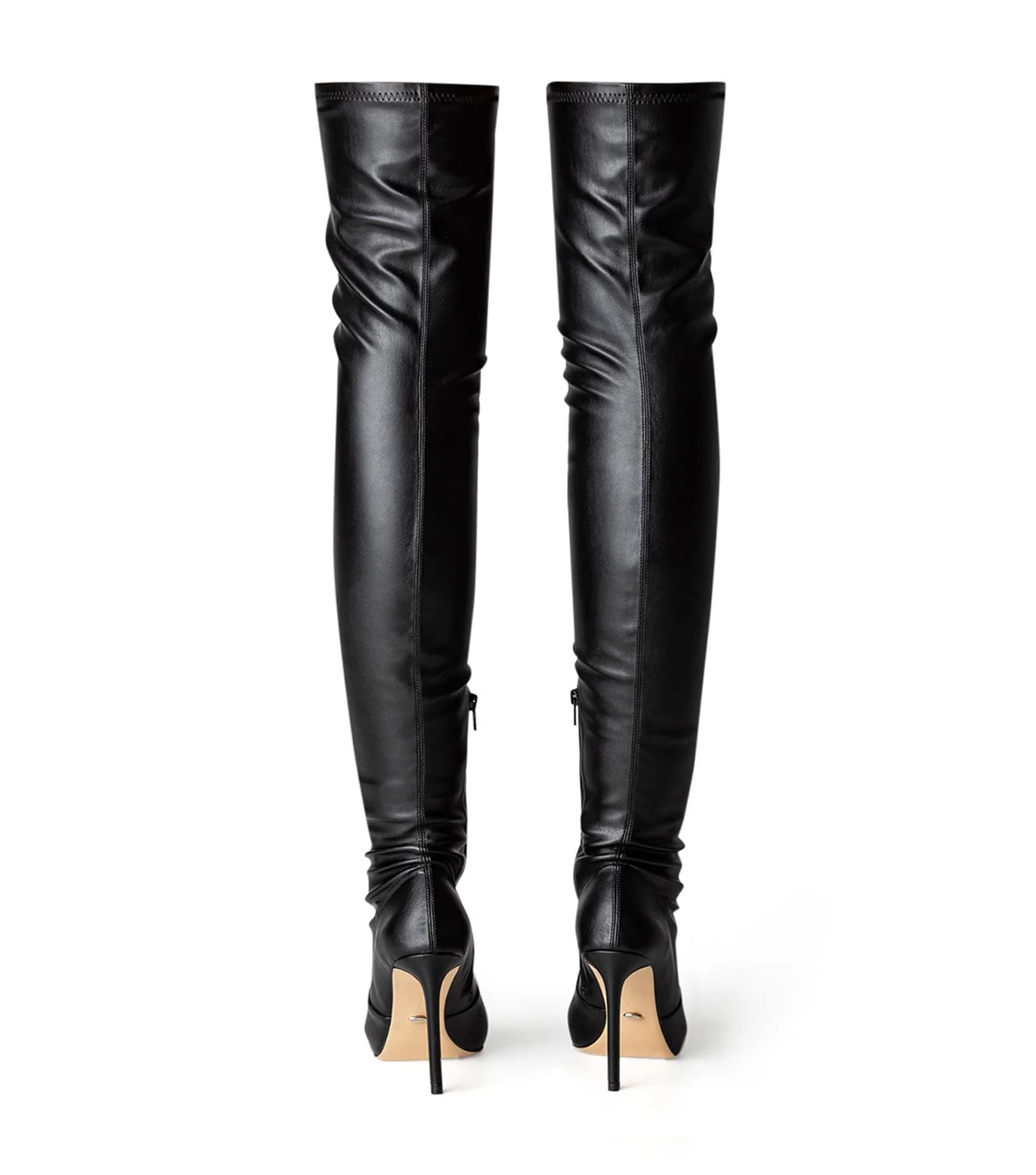 Sometimes more is more, especially with Avah our latest black thigh-high boot. With an ultra high over-the-knee silhouette, chic stiletto heel and elongated point, this design is here to level up the glamour in your wardrobe, one step at a time.