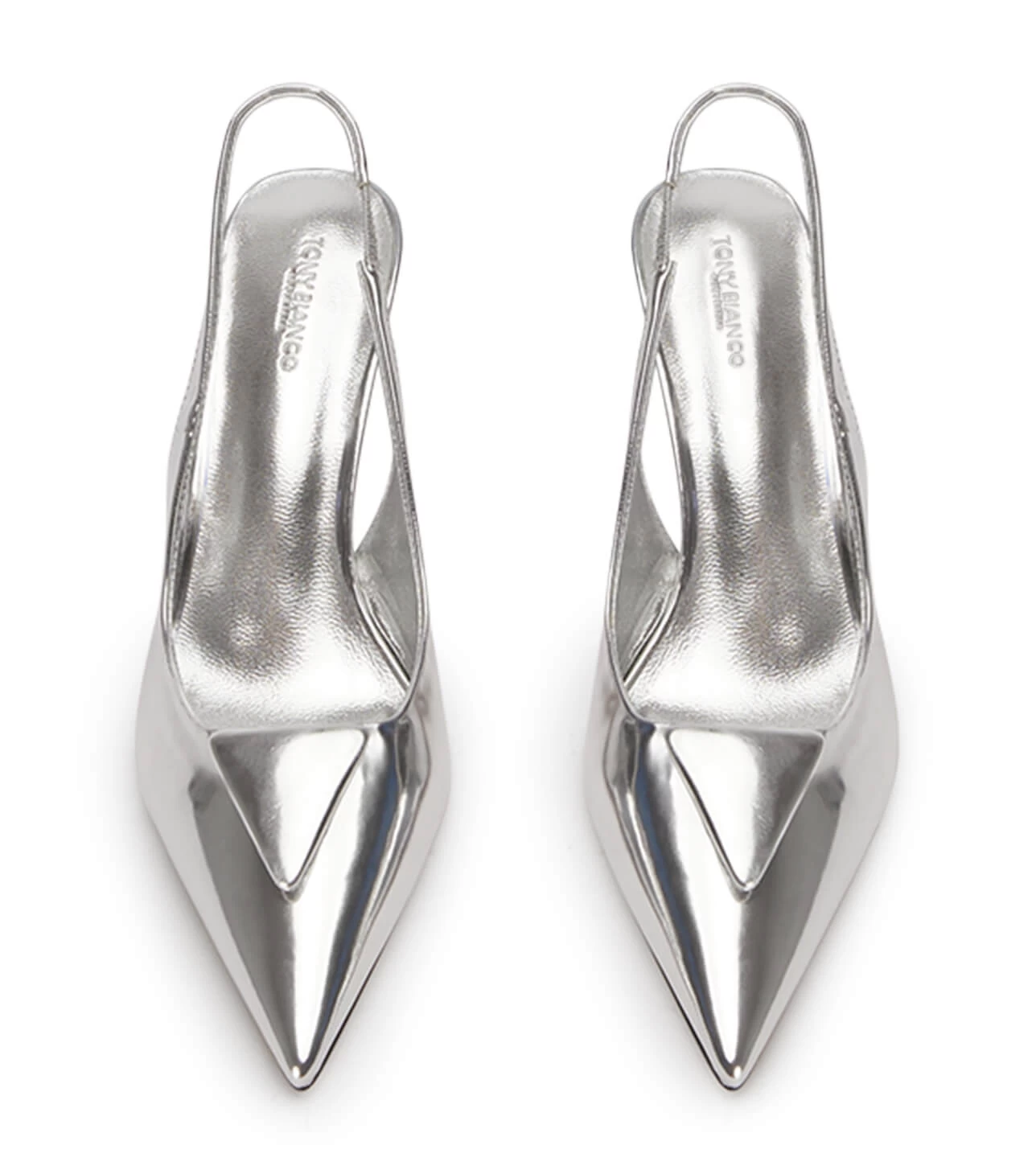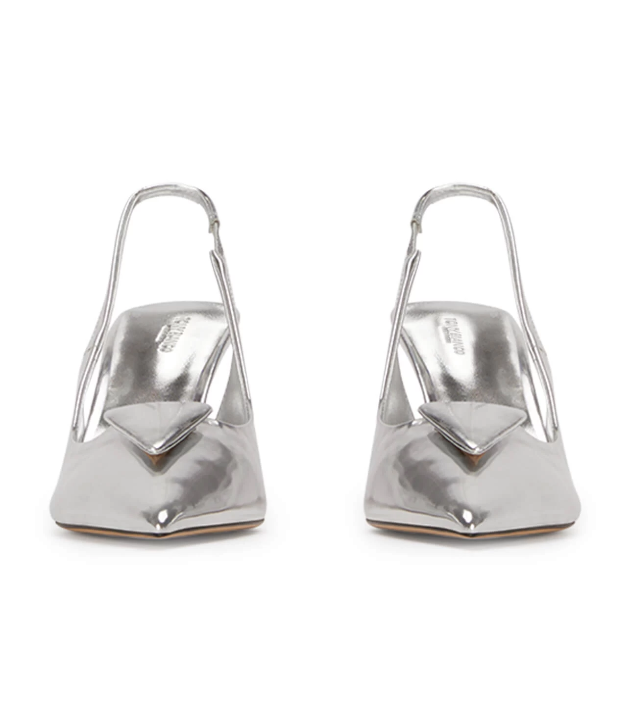 Introducing our answer to the perfect pointed-toe sling-back heel, Bertie. Encapsulating chic sophistication, this pump features an angular heel, sleek pared back design and triangular plaque detailing. Finished in our signature silver shine for a polished modern look.