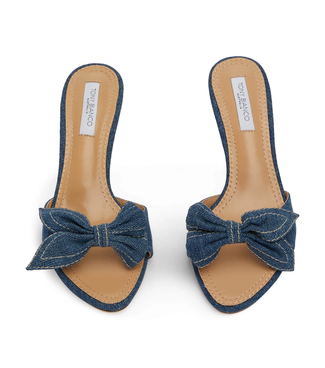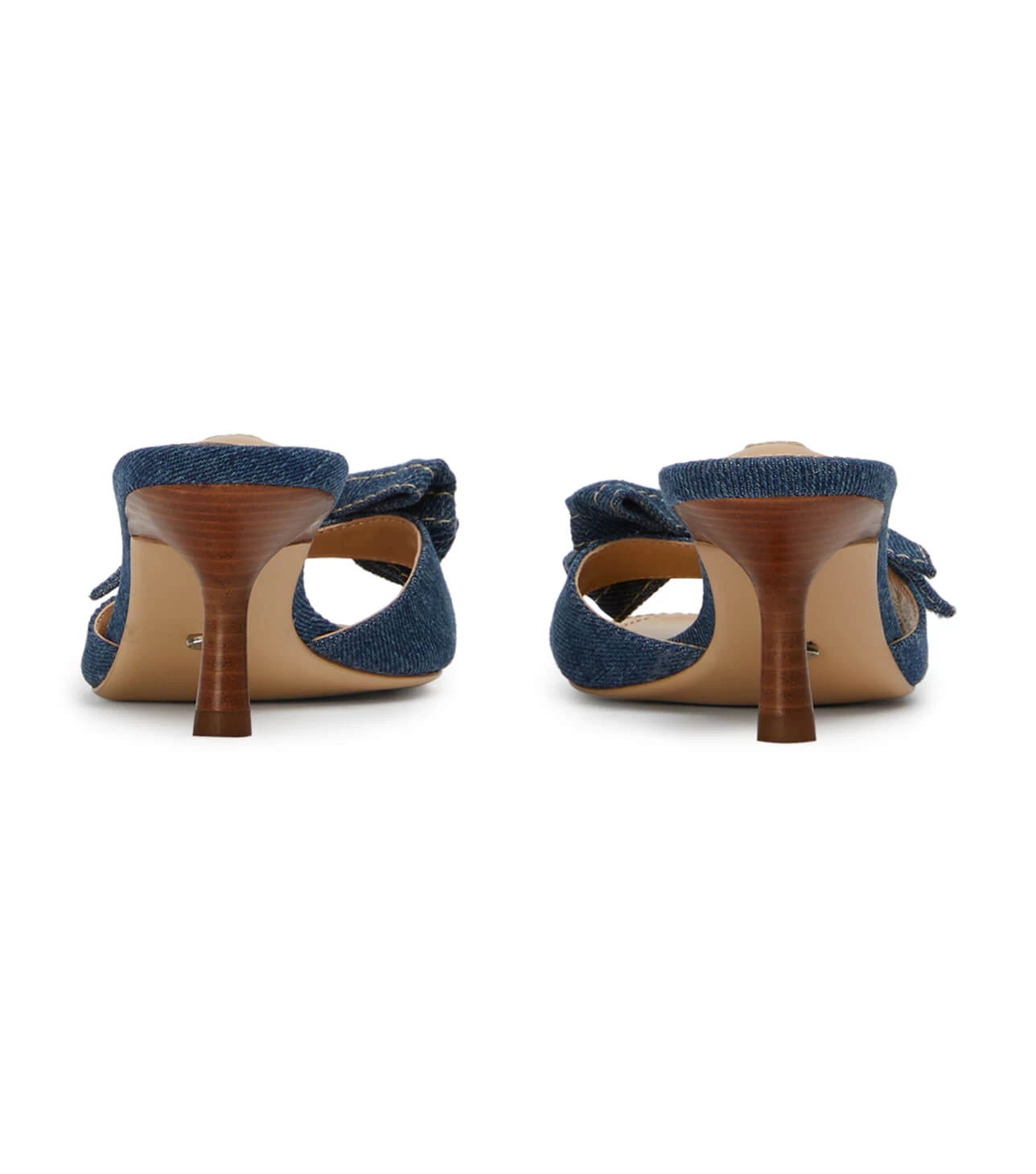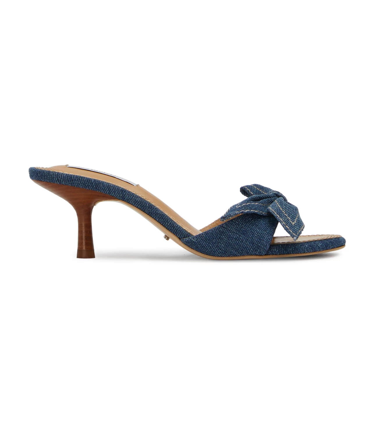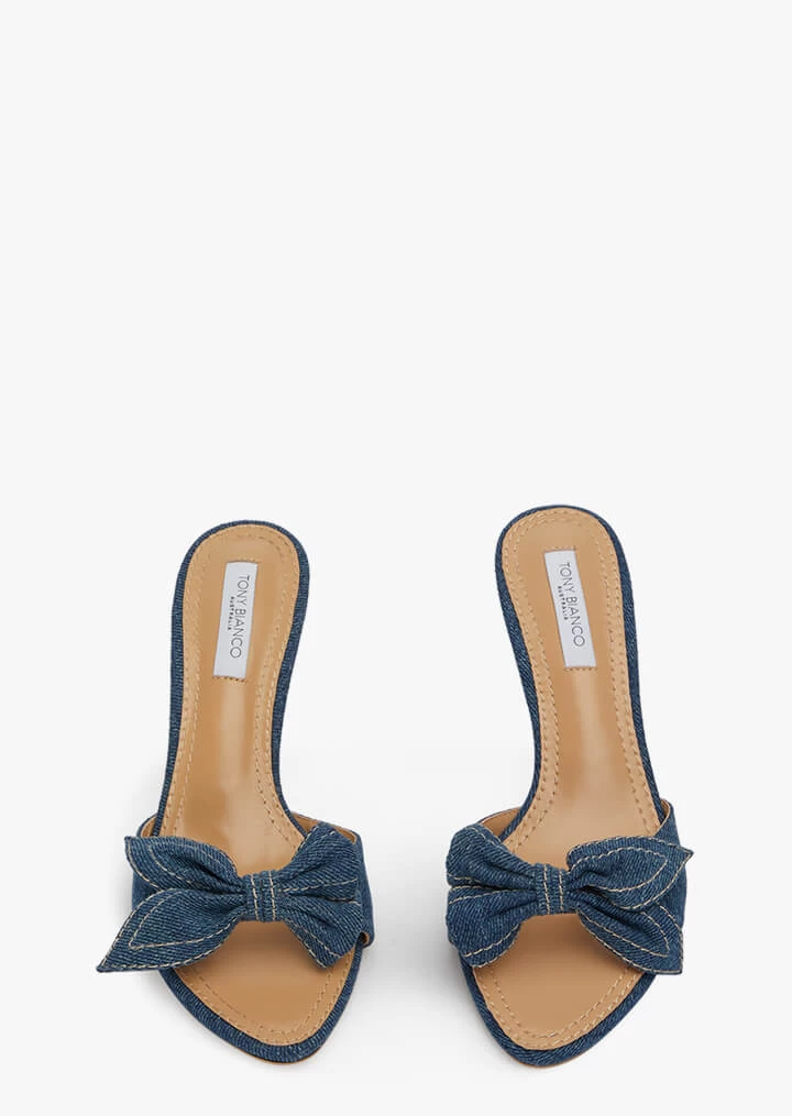Add the finishing touch to your look with Dakota. This mule is simplistic perfection featuring a single strap across the toes, complete with a denim bow on top.