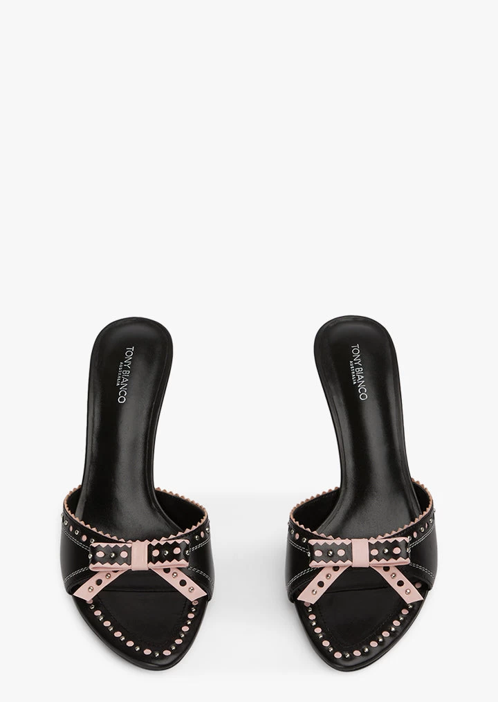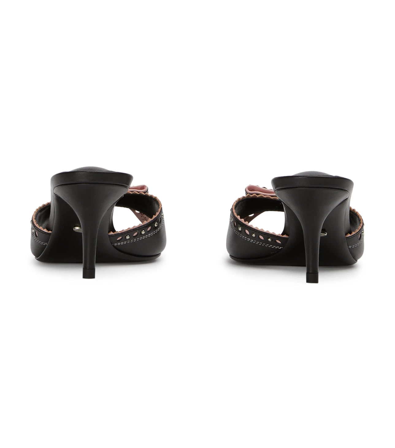 Be enchanted by Denise, our vintage inspired mule that charms with her intricate detailing. Finished in our classic black leather, this heel consists of a scalloped vamp, dainty leather bow and silver studs.