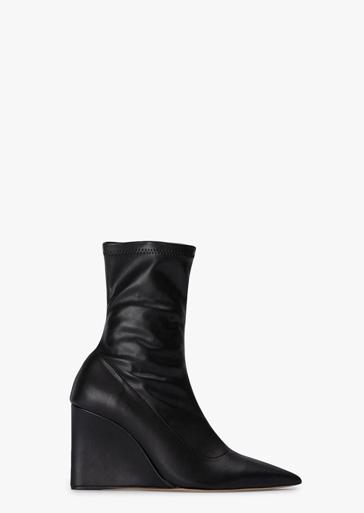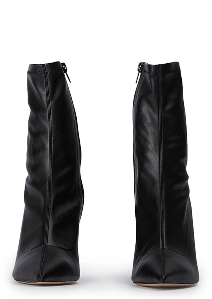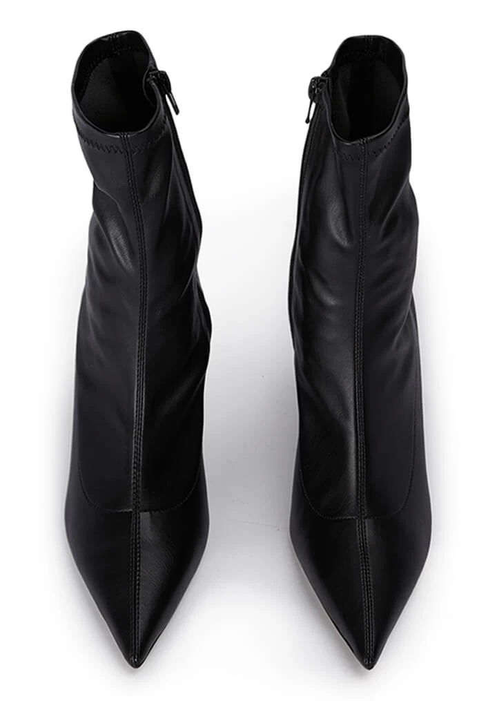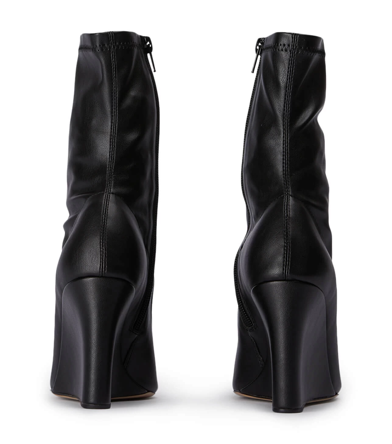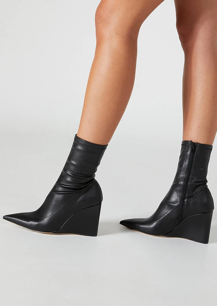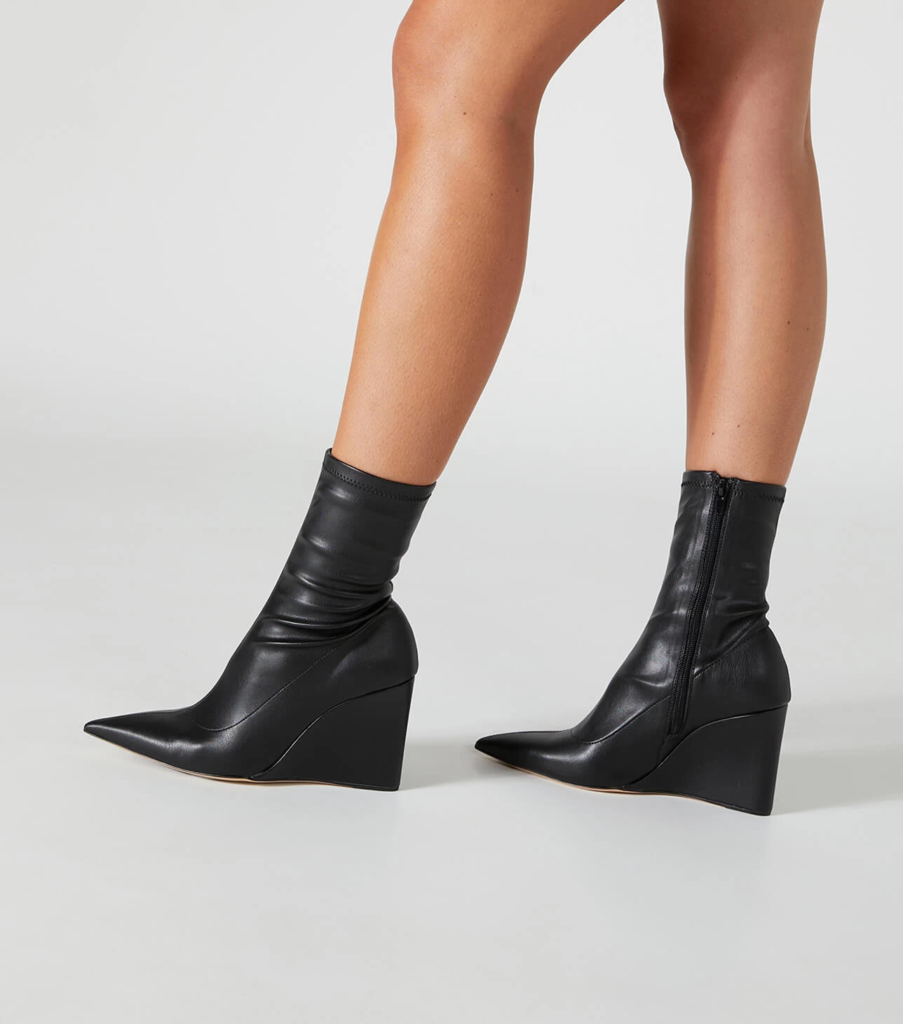 Meet Diplo. This highly on trend ankle boot featuring a wedge heel and pointed toe will ensure all eyes are on you. Complete with a sleek leather look and fitted upper for the ultimate finish. What are you waiting for?