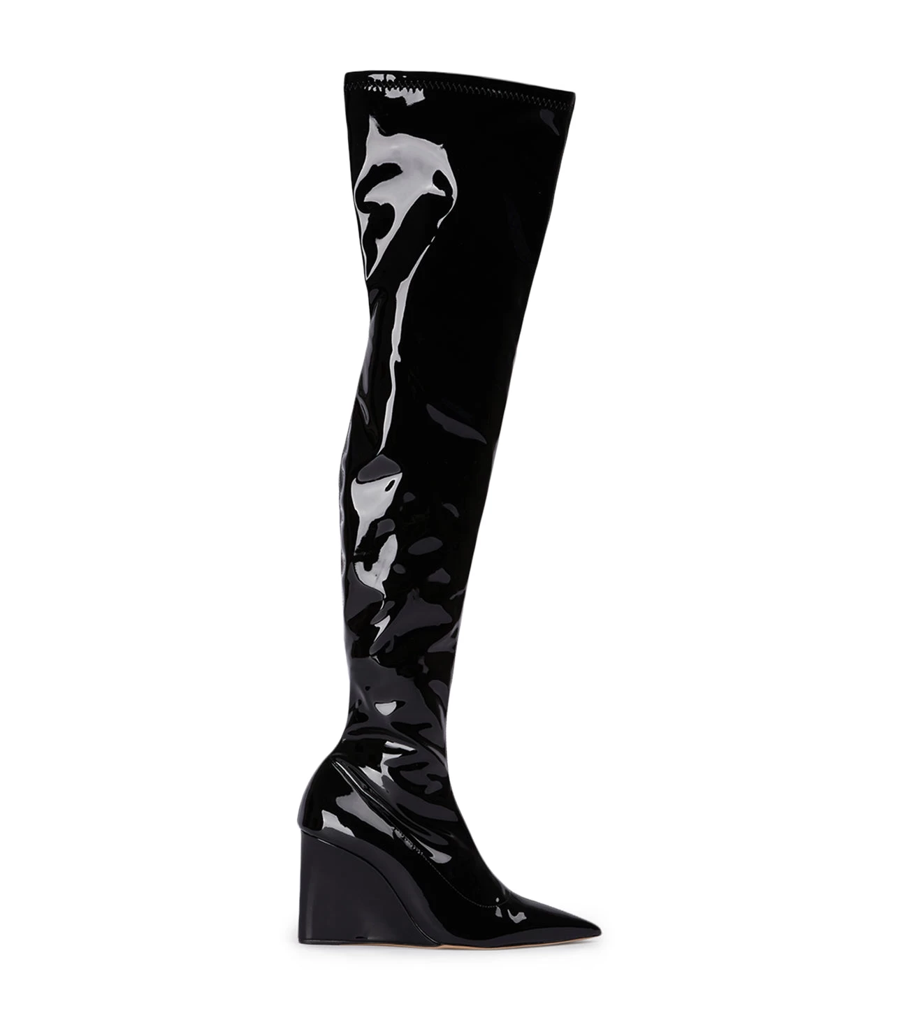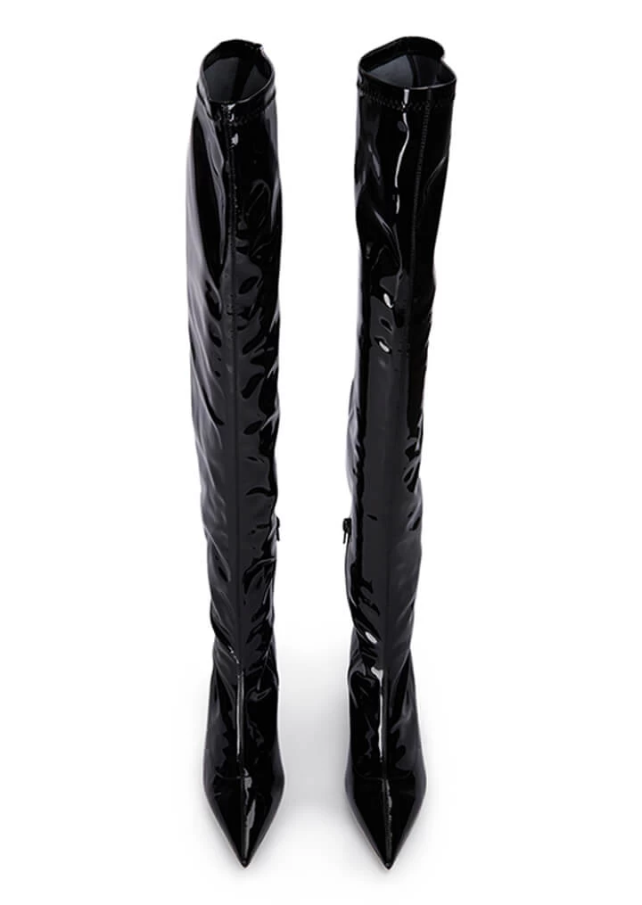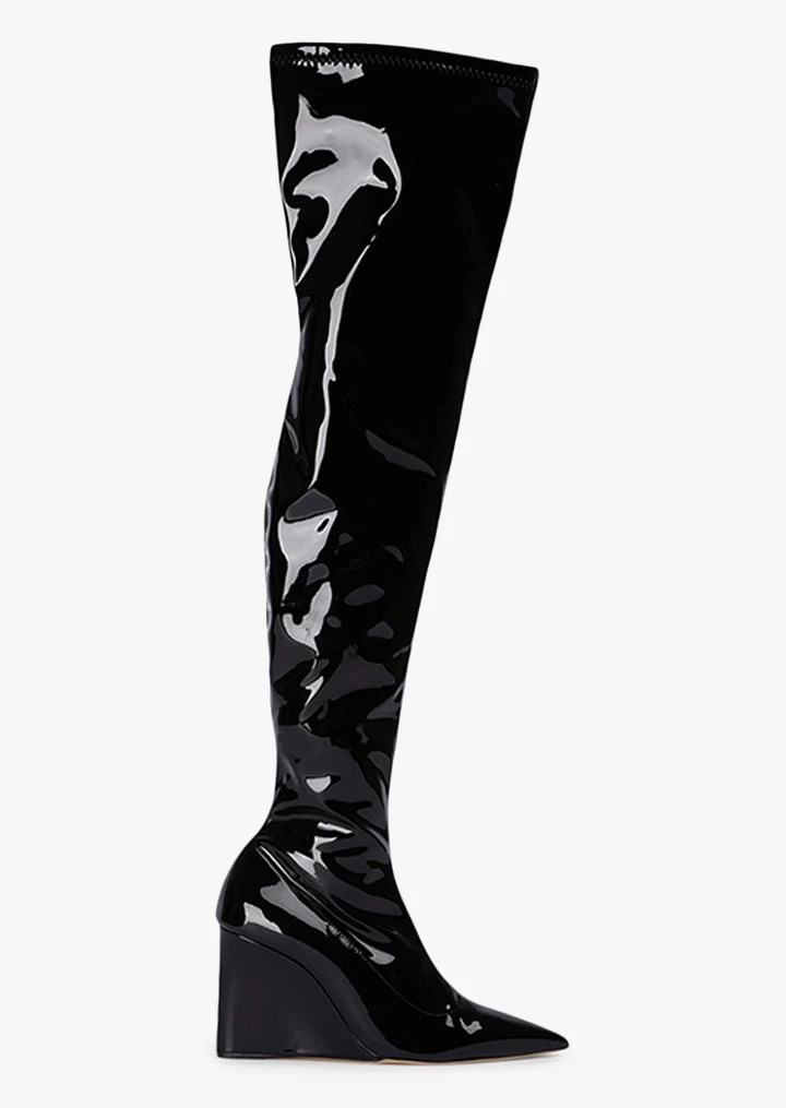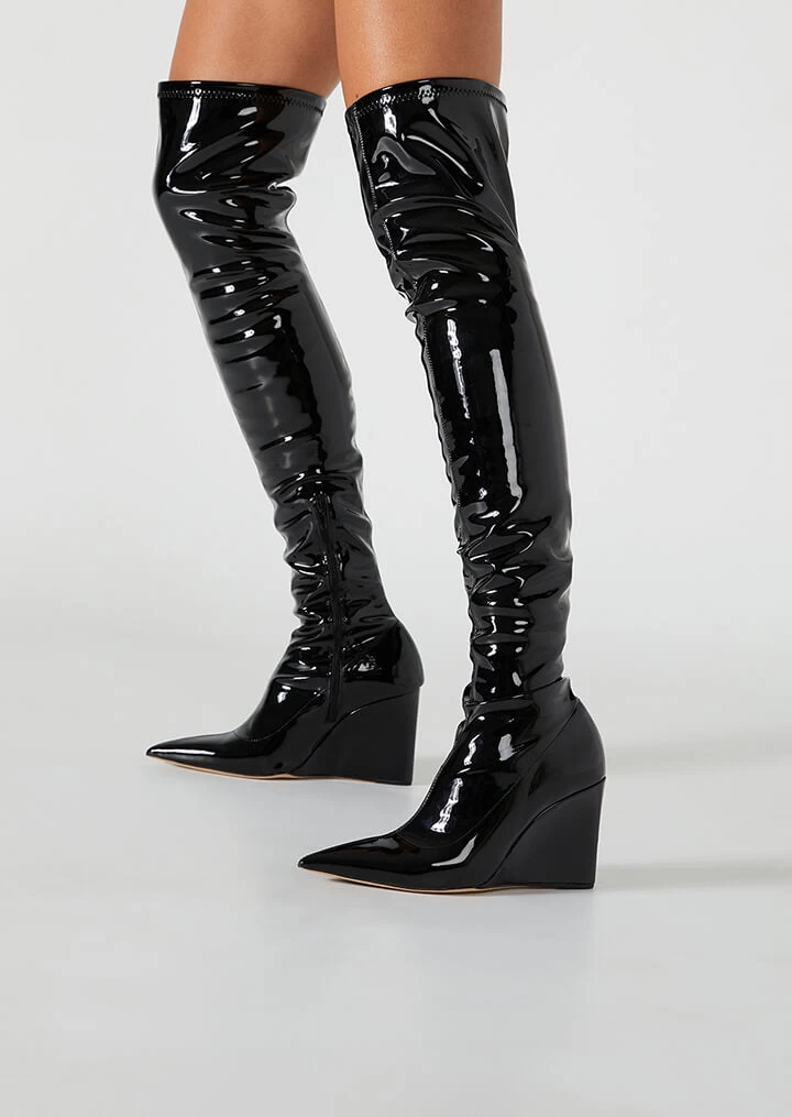 Be bold in Doja this season. Fiercely on trend, this thigh high style features a wedge boot and sleek finish. Wear yours all night long.