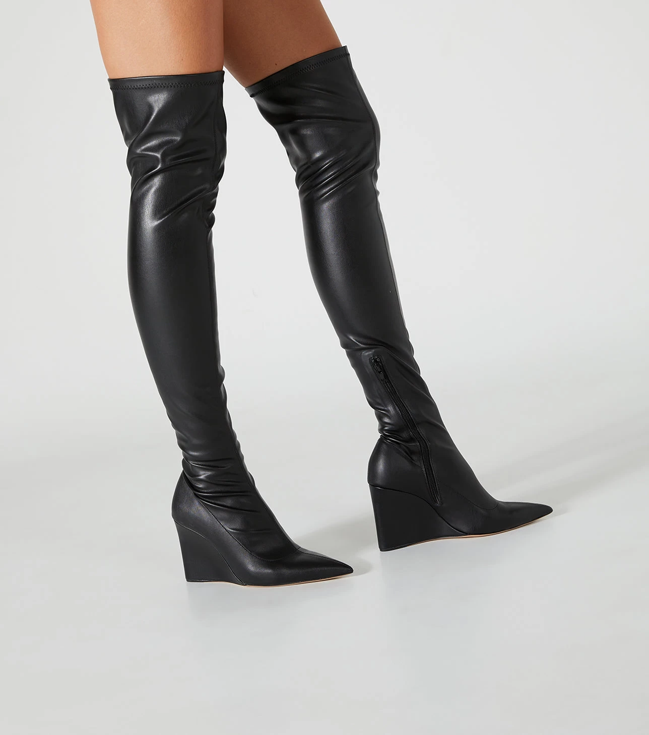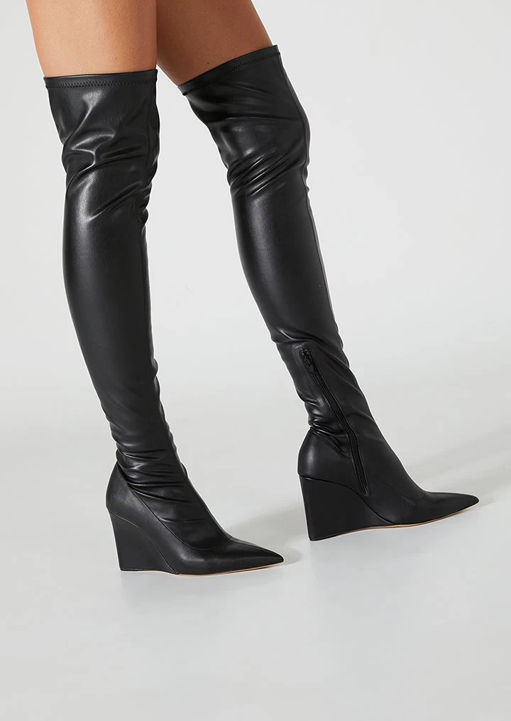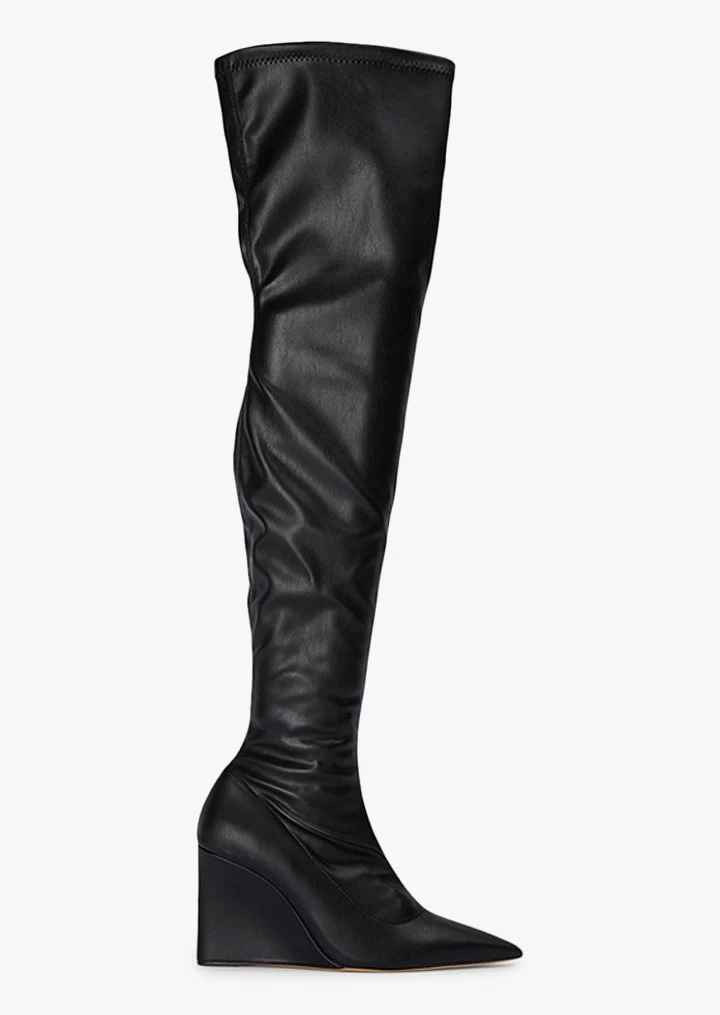 Be bold in Doja this season. Fiercely on trend, this thigh high style features a wedge boot and sleek finish. Wear yours all night long.
