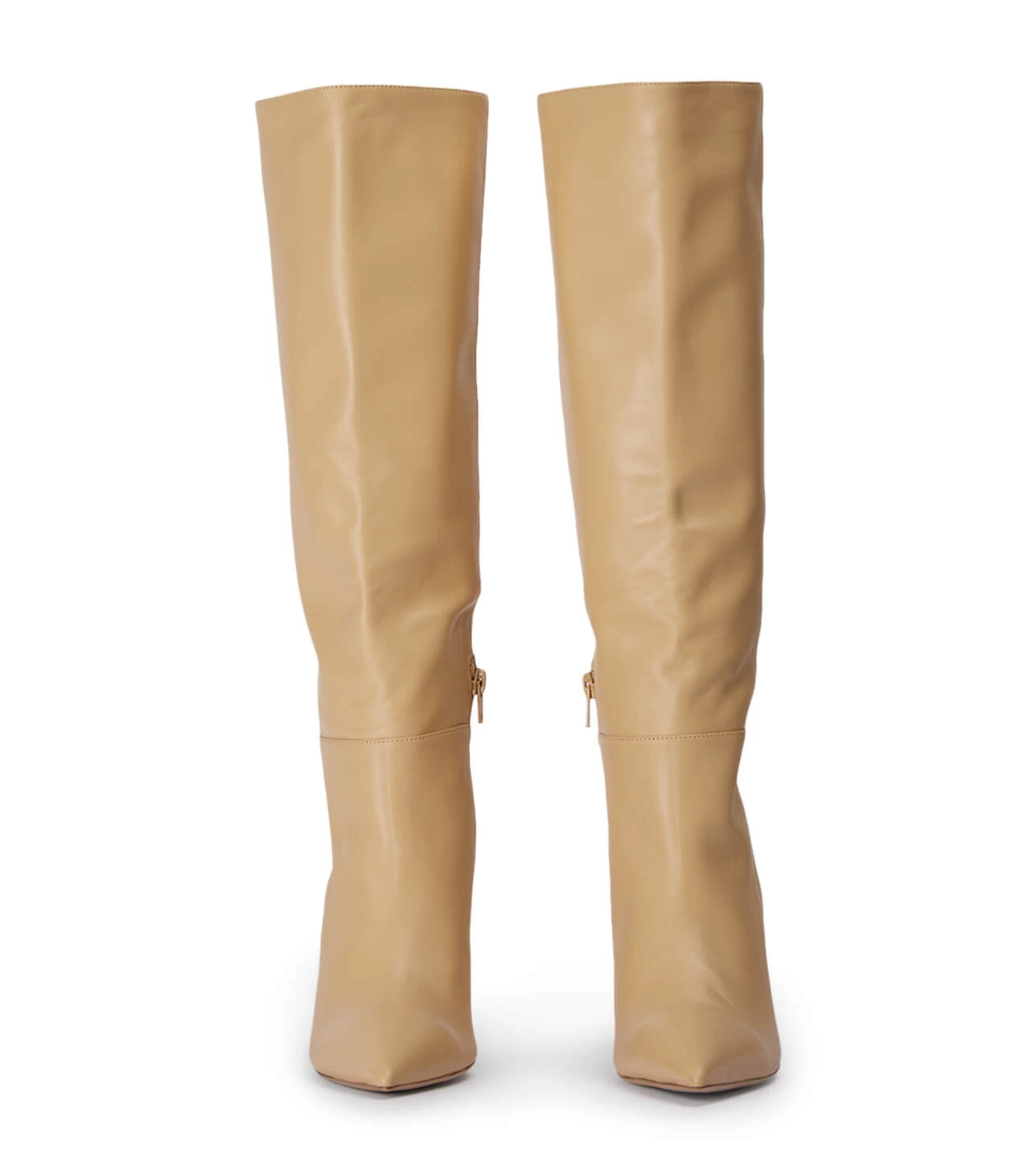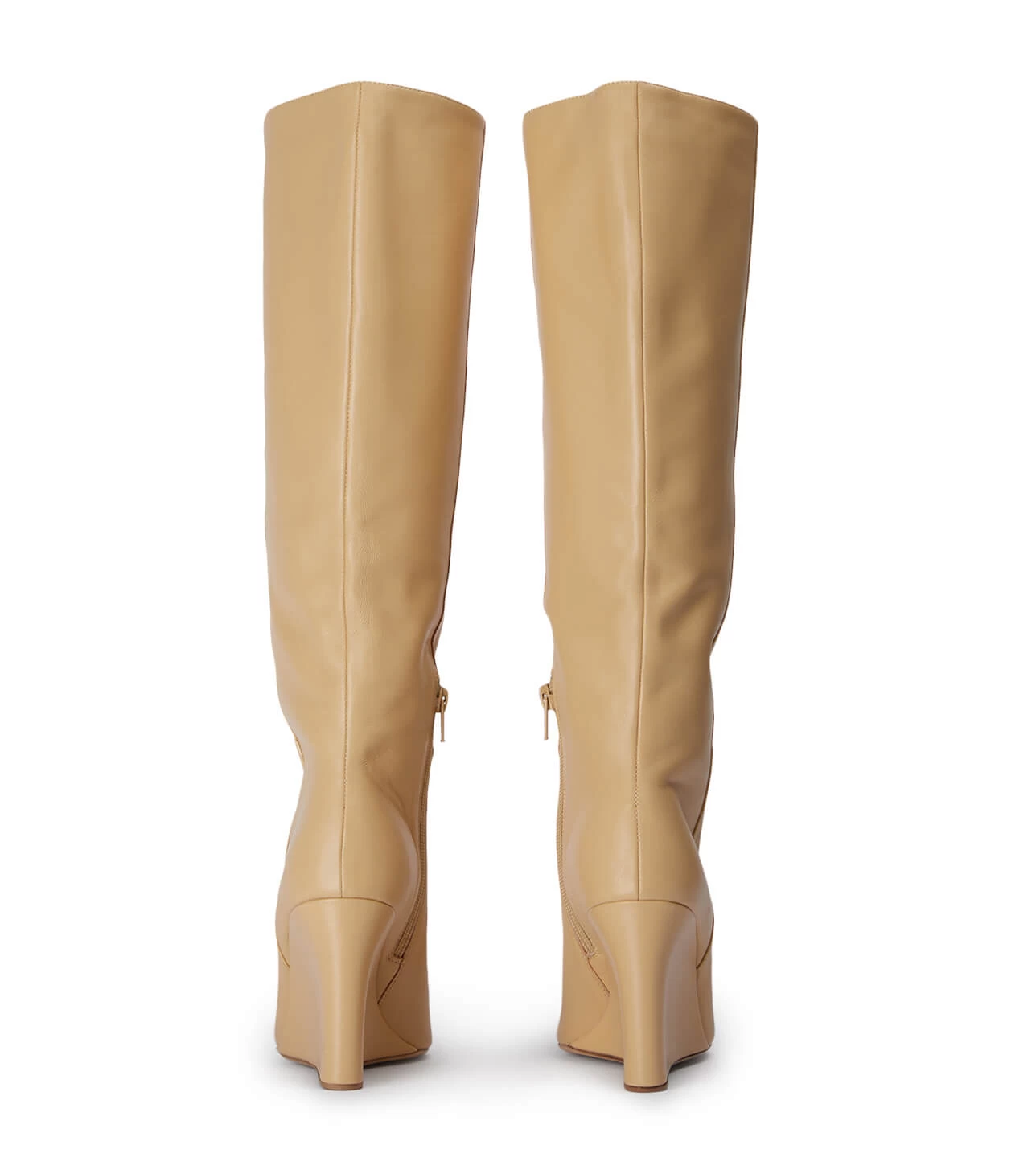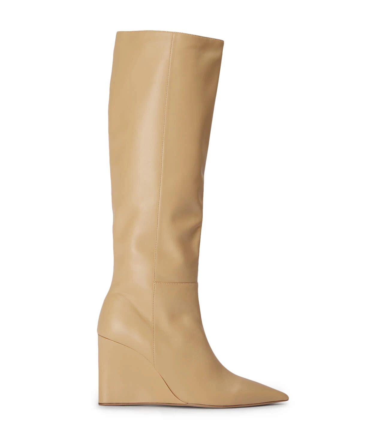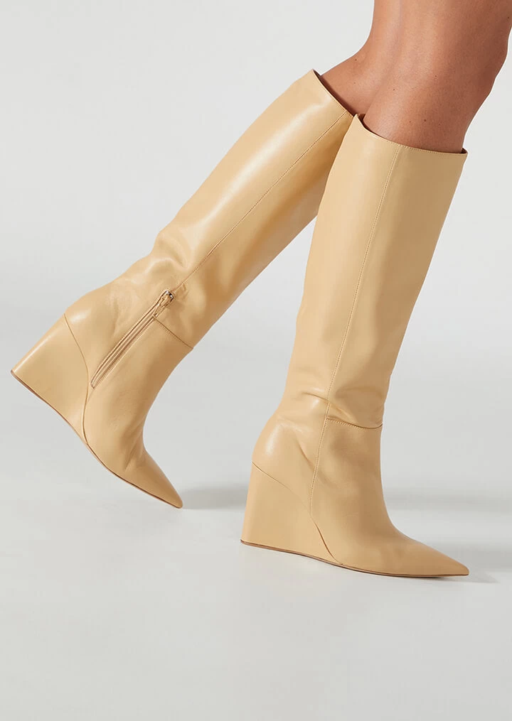 Here and hotter than ever, the Drake calf boot in timeless butter nappa leather. Featuring an elongated pointed toe, inner ankle zip and a 9.5cm wedge heel. This style is cool-girl personified and ready to become part of your constant rotation.