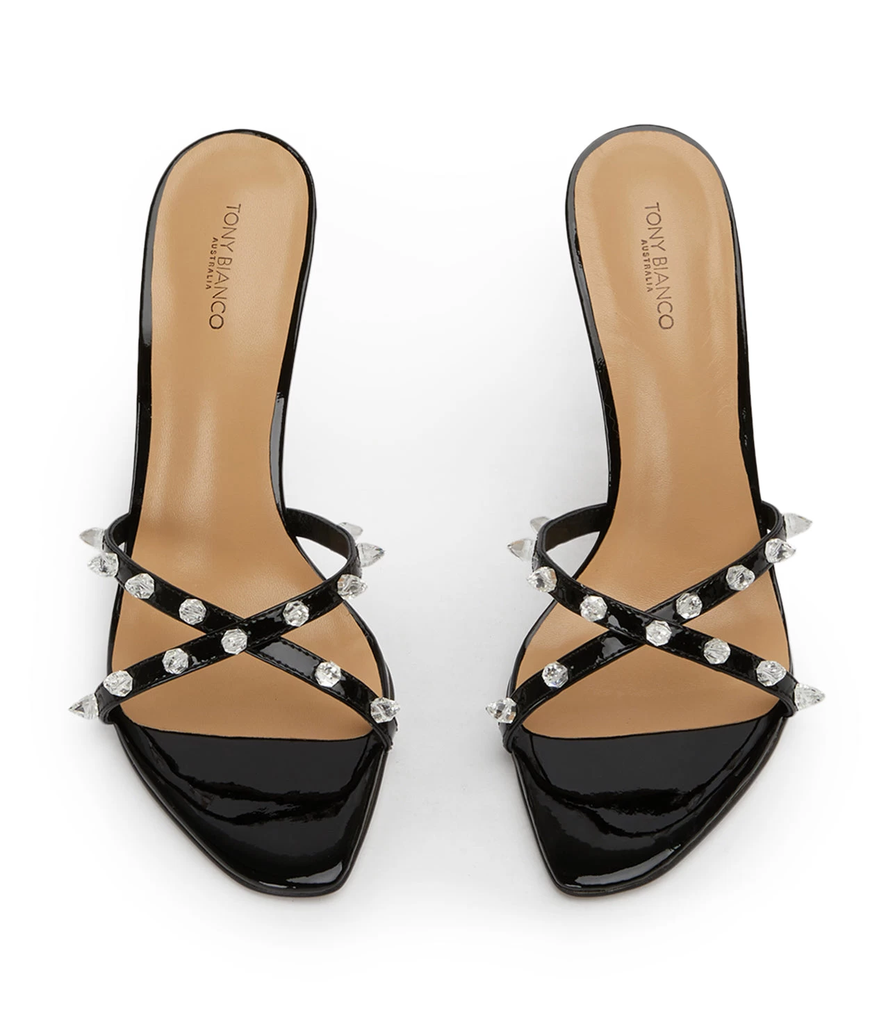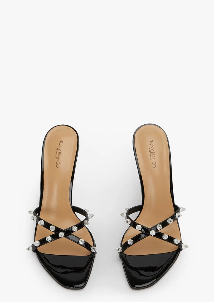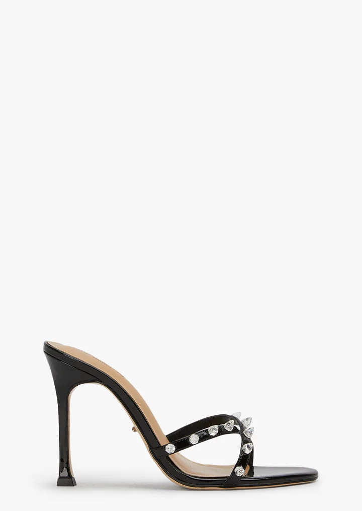 Born to stand out? Look no further then Duo. This black patent stiletto heel makes a statement, donning diamante spikes across its crossover foot straps.