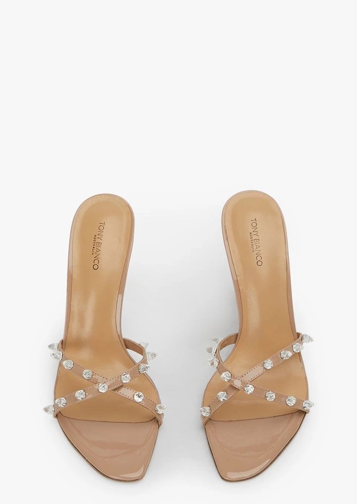 Born to stand out? Look no further then Duo. This nude patent stiletto heel makes a statement, donning diamante spikes across its crossover foot straps.