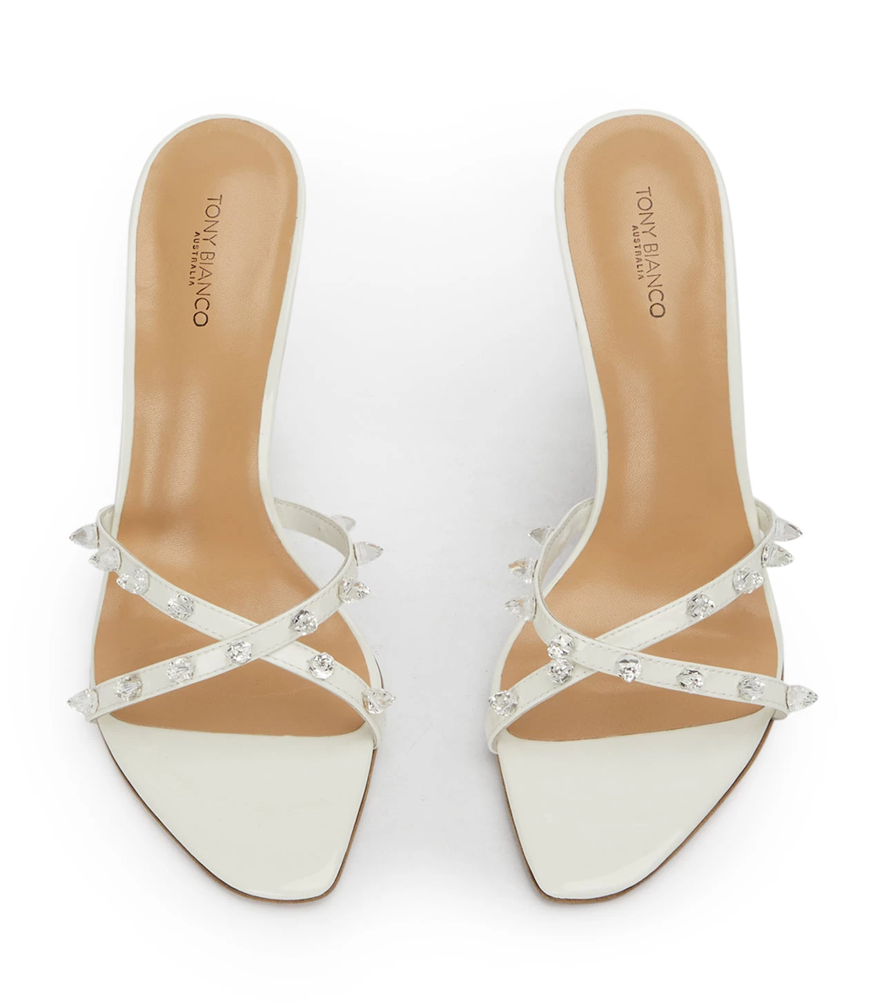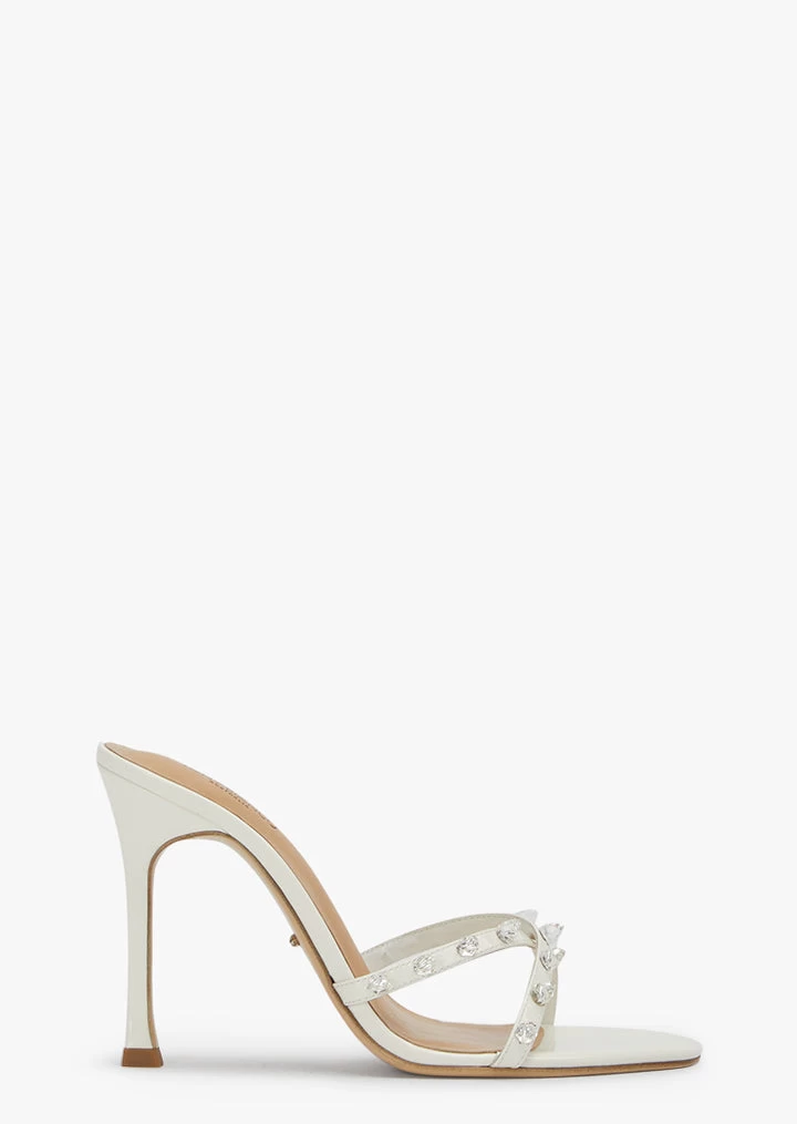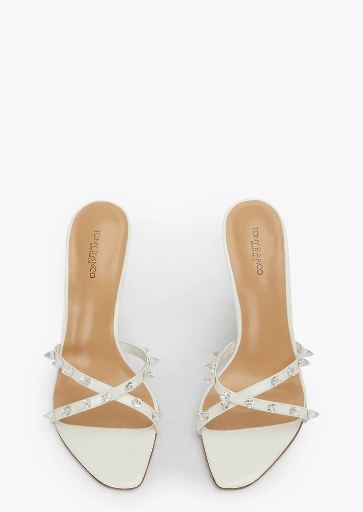 Born to stand out? Look no further then Duo. This white patent stiletto heel makes a statement, donning diamante spikes across its crossover foot straps.