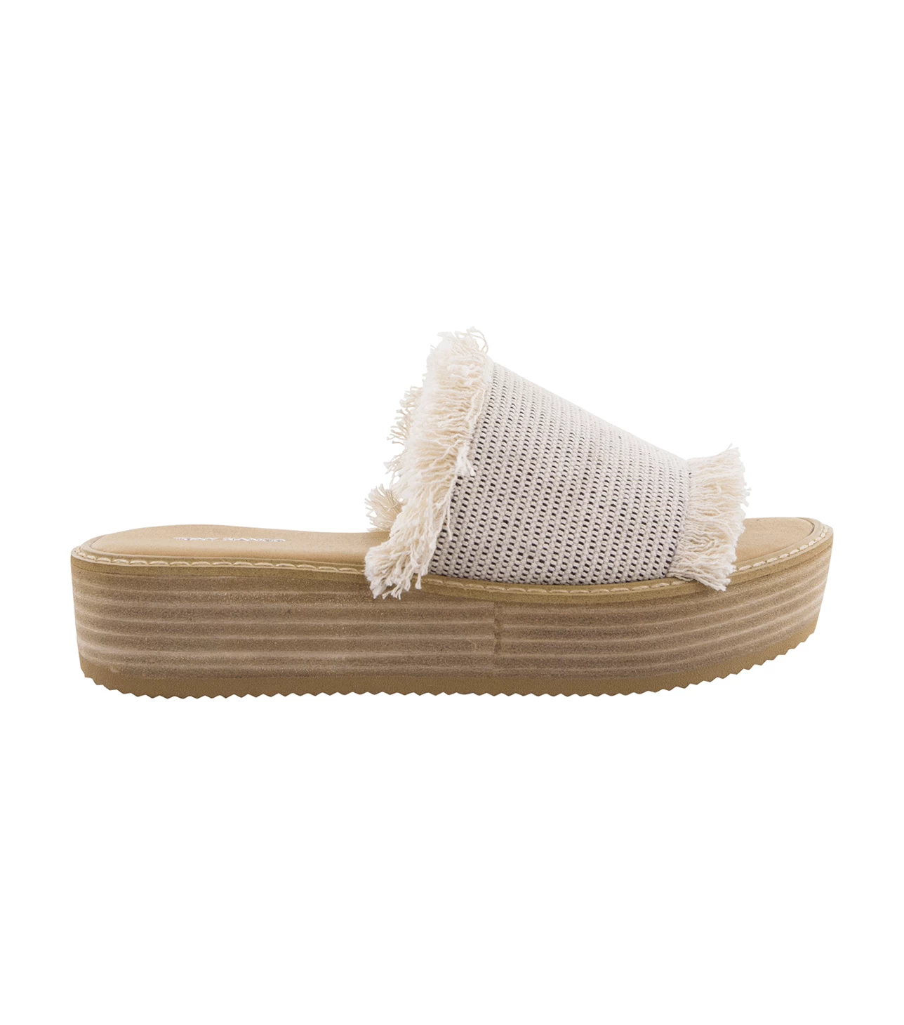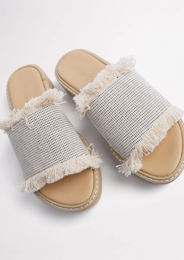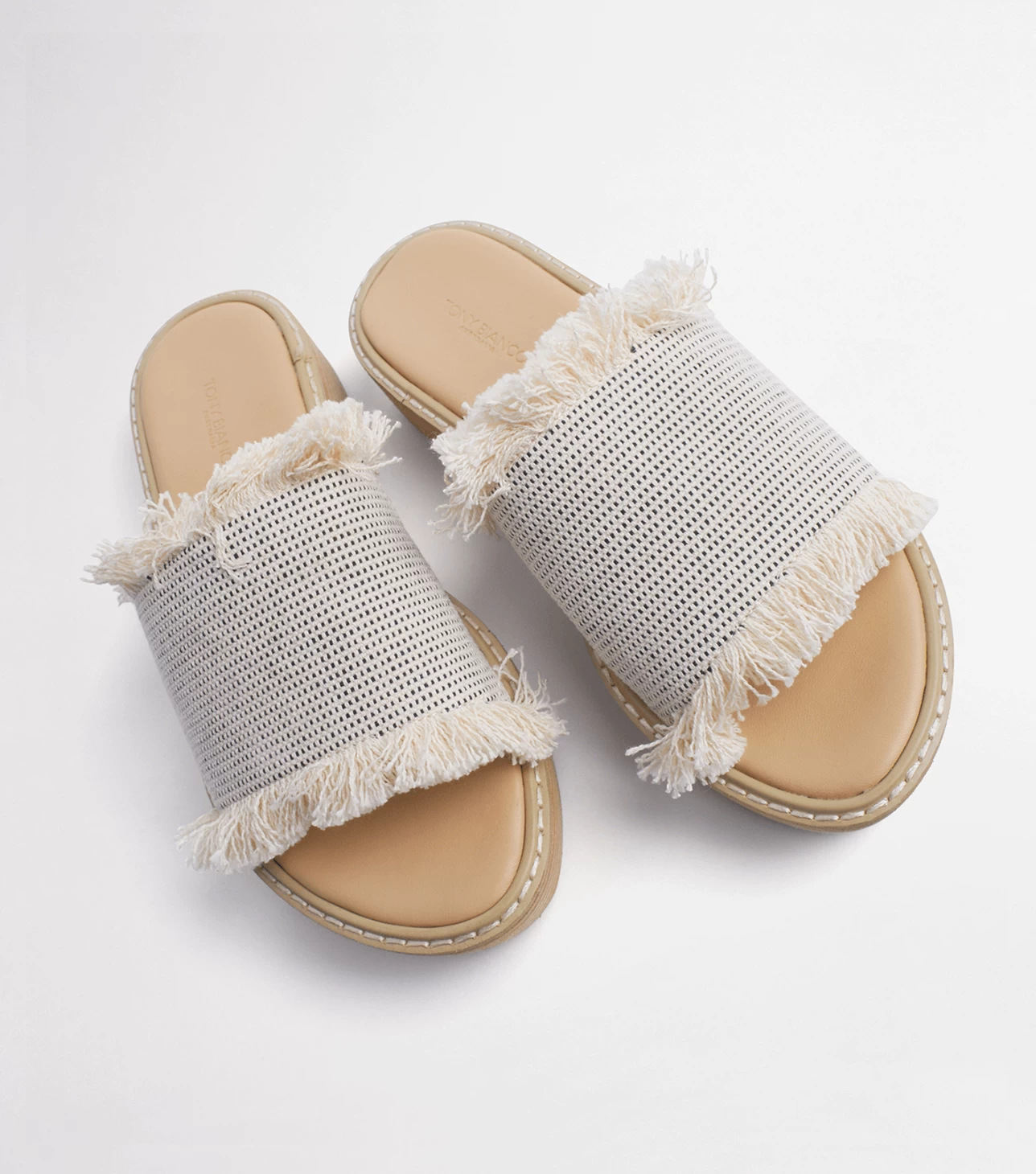 Slip into elevated comfort with the Ebony sandals. Showcasing a textured white and black cotton fringed upper with an open rounded toe and a platform sole.