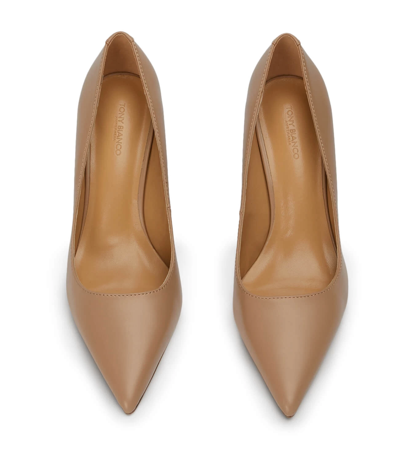 A nude leather pointed toe pump with a mid-height stiletto heel. – Leather upper and lining – Long pointed toe shape – Covered stiletto heel Heel Height: 8.5cm
