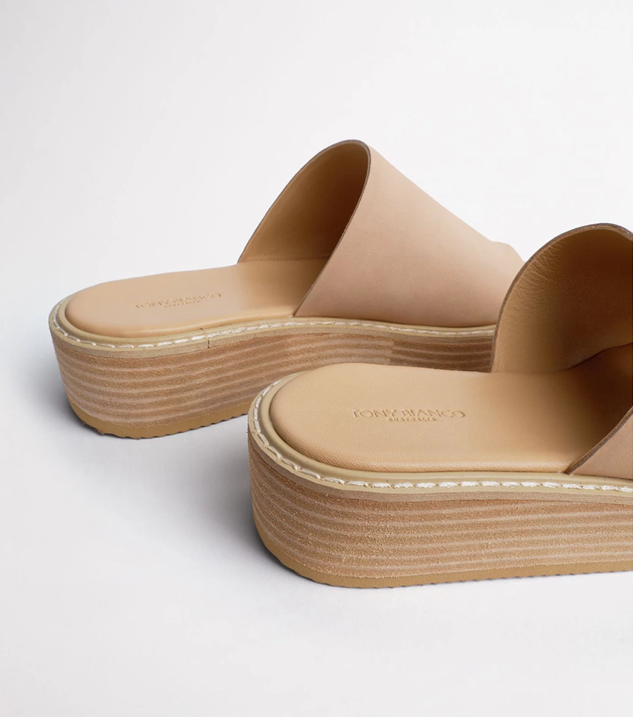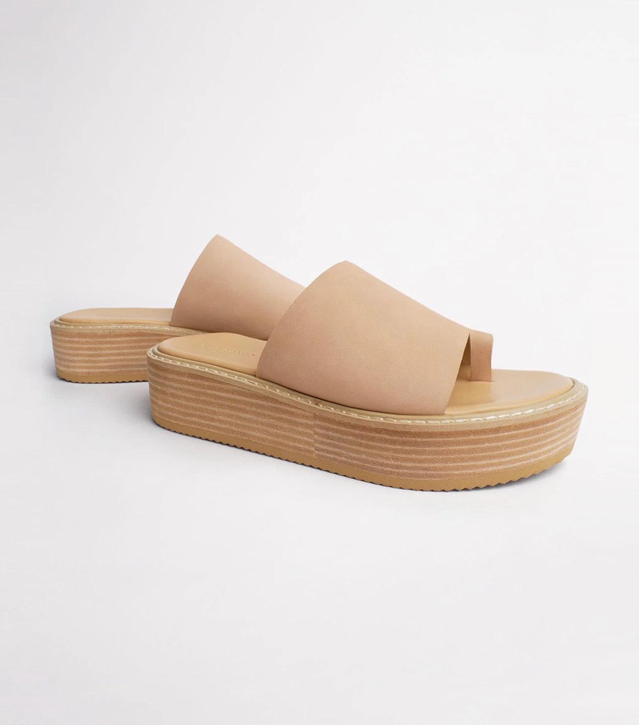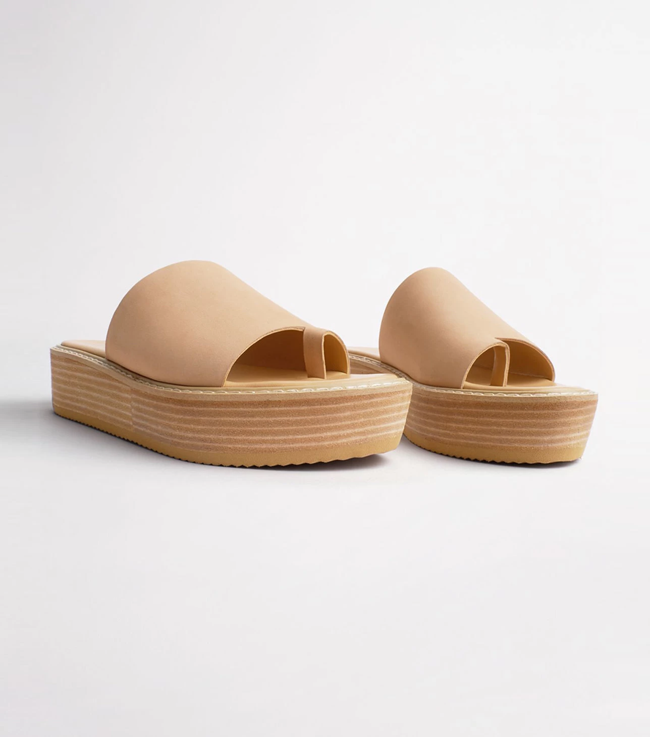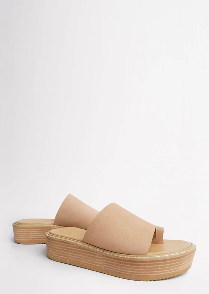 Say hello to comfort! The Energy sandals feature a neutral leather slip on sandal with a ring peep-toe with a rounded toe-shape and an exposed wooden flatform.