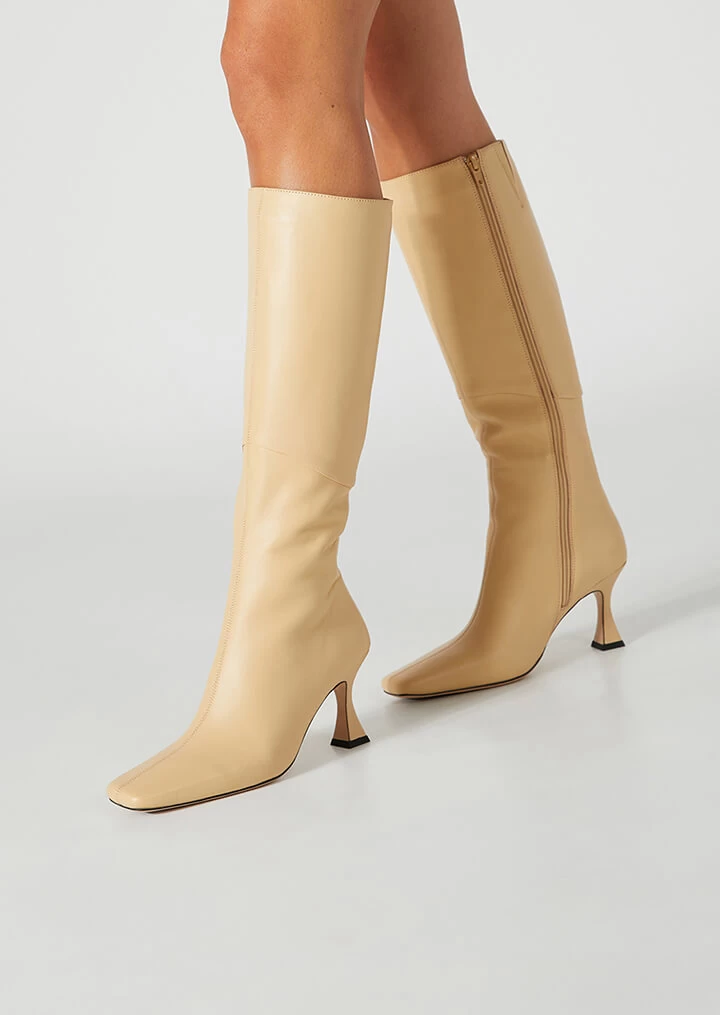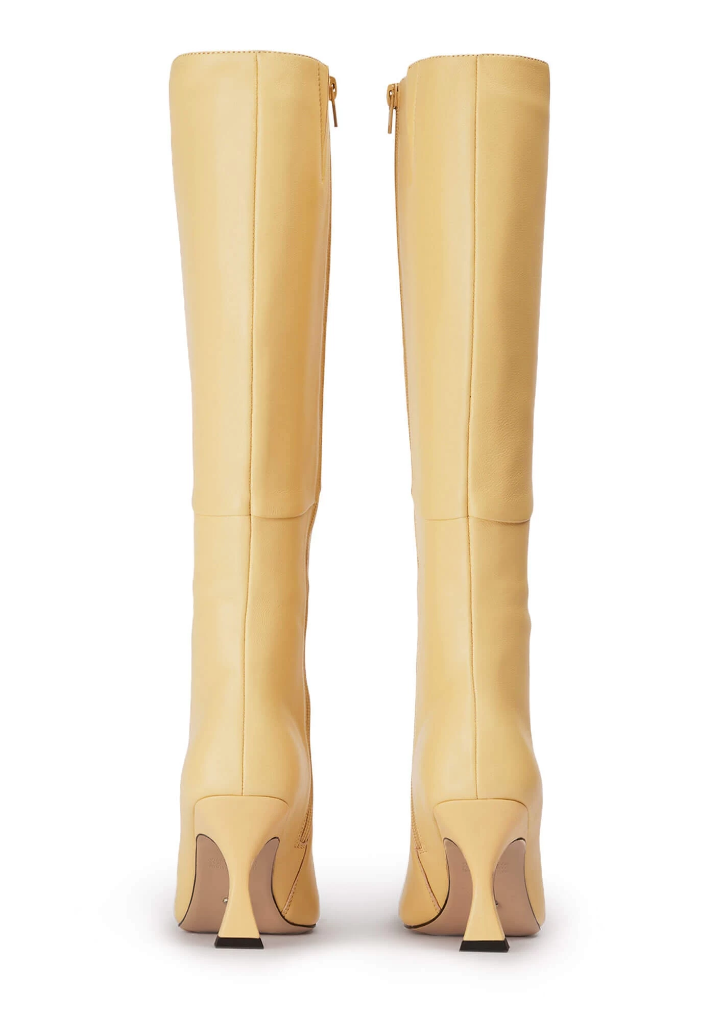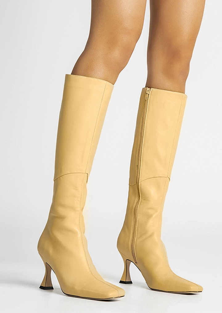 Make your dreams come true with our Fantasy knee-high boot. Showcasing a buttery hue alongside a statement hourglass shaped heel, an extended squared toe-shape and an inner zip to easily slip on and go. Pair with your layering essentials to keep warm with these cooler months.