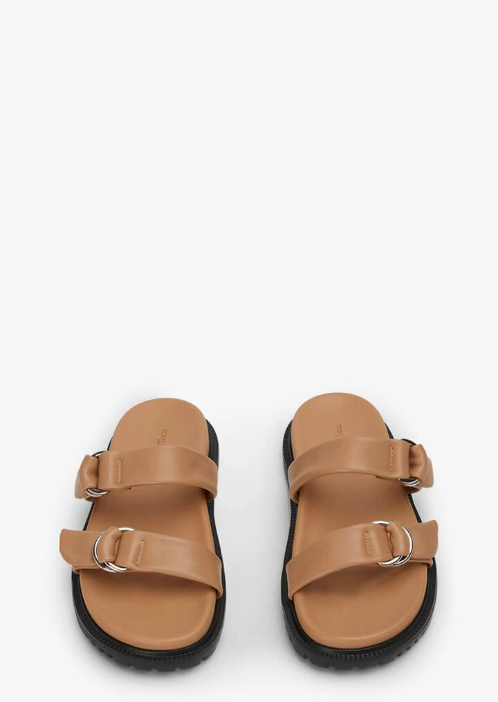 Simplistic and stylish is Frampton , our two strap tan leather sandal. Featuring silver hardware, this slide will effortlessly work its way into your daily Spring/Summer wardrobe.