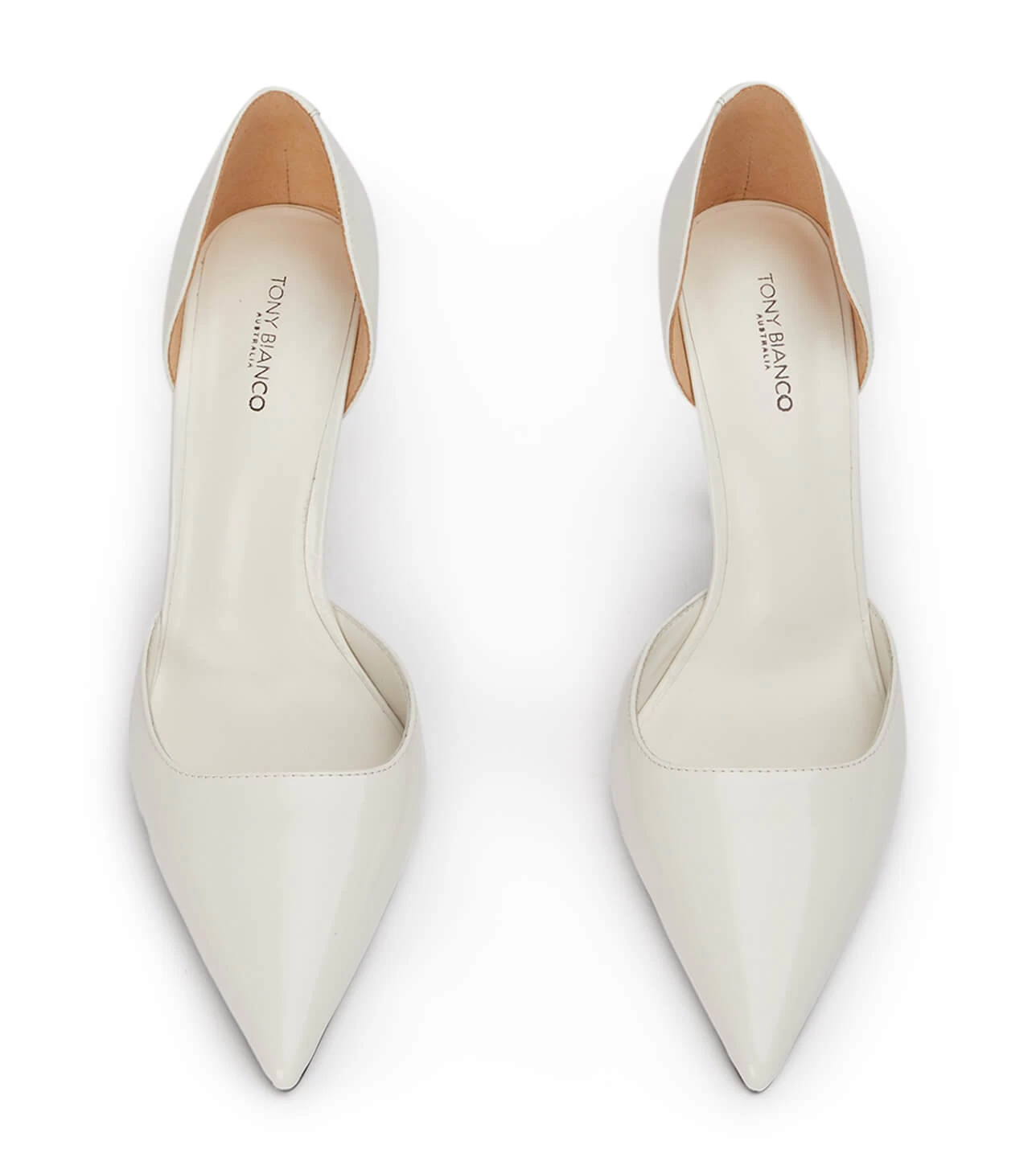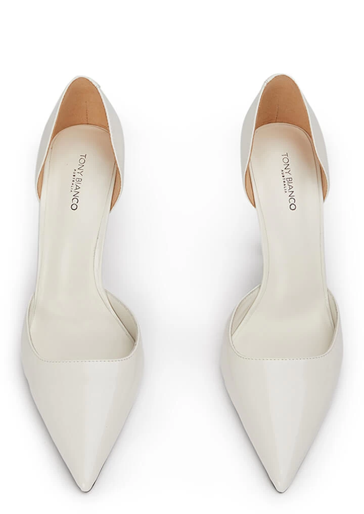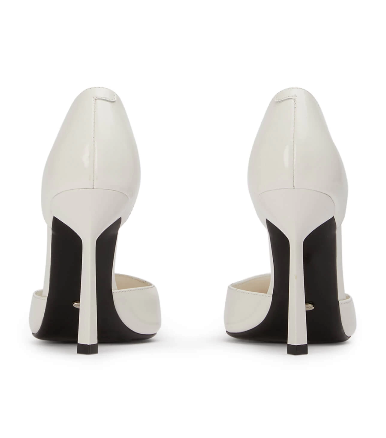 Make an entrance in Gala. Our modern interpretation of the classic pump, featuring an elegant pointed toe-shape, asymmetric heel and square vamp. Simplistic in design, this white hi-shine heel will ensure versatility all season.