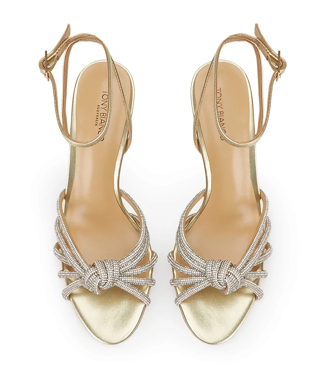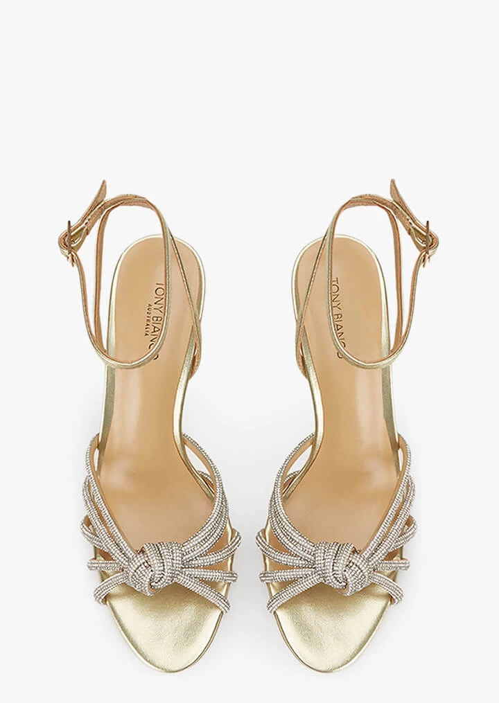 Here and hotter than ever are the gold Helena stiletto heels. Leaning into glamour with a knotted diamante upper, metallic finish and slender ankle strap, this style is destined to turn heads.