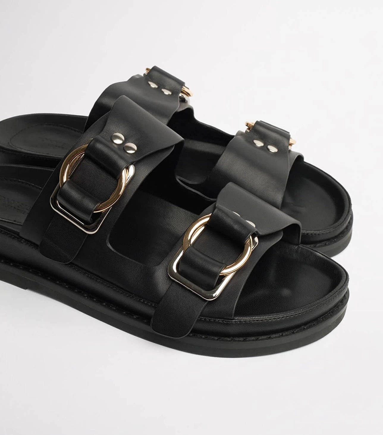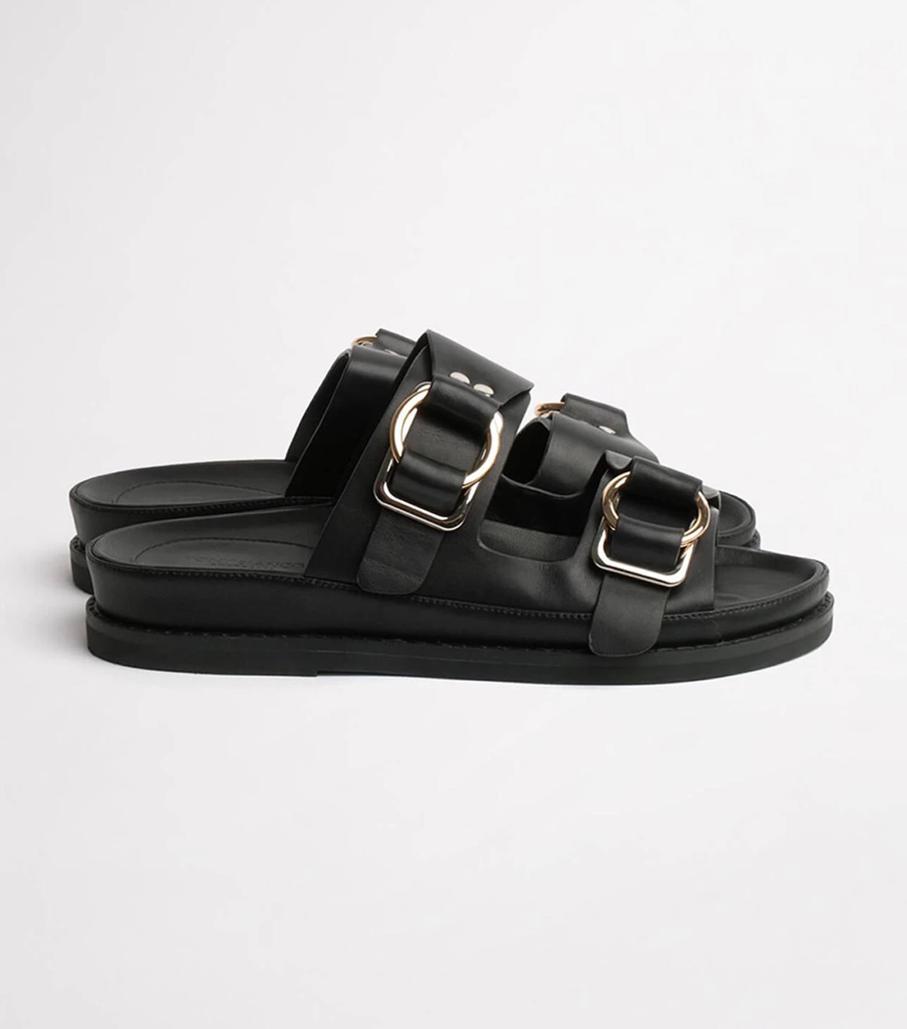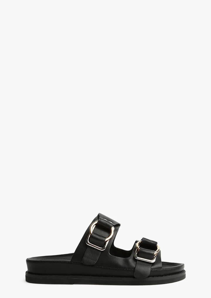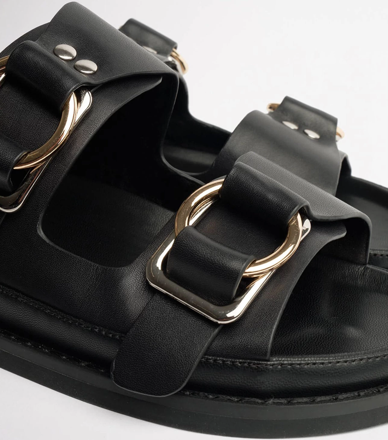 Introducing your new ride or die, Hunter. The flat slides designed for summer-time adventures, around-the-house wear or for a day full of errands – whatever your reason, Hunter has you sorted. Designed with a flat cushioned foot-bed and a thick chunky sole, alongside a round open toe and a flattering two-strap leather upper and all new leather lining. Finished with silver-toned hardware and a gold toned circular ring.