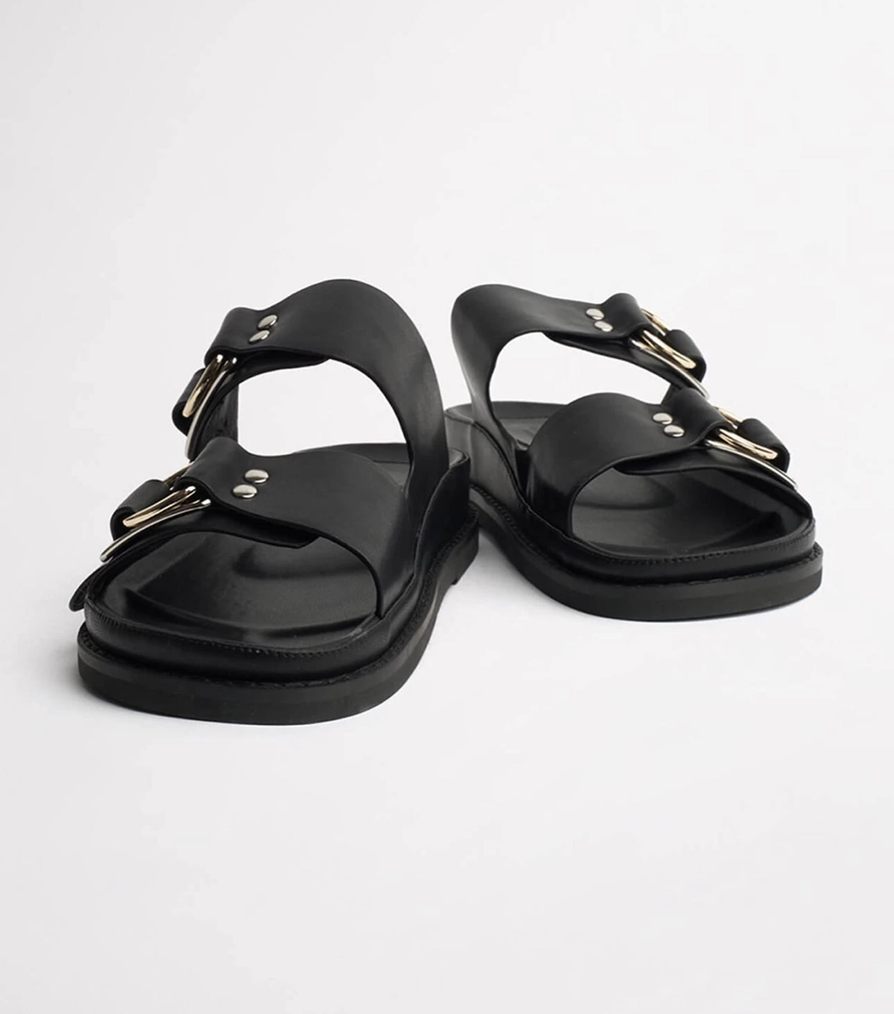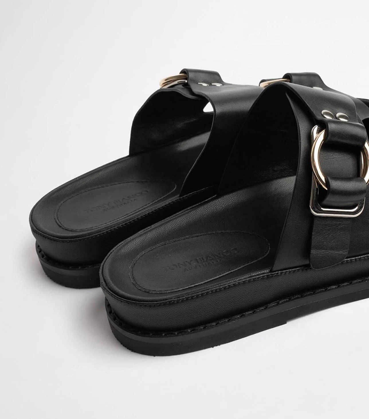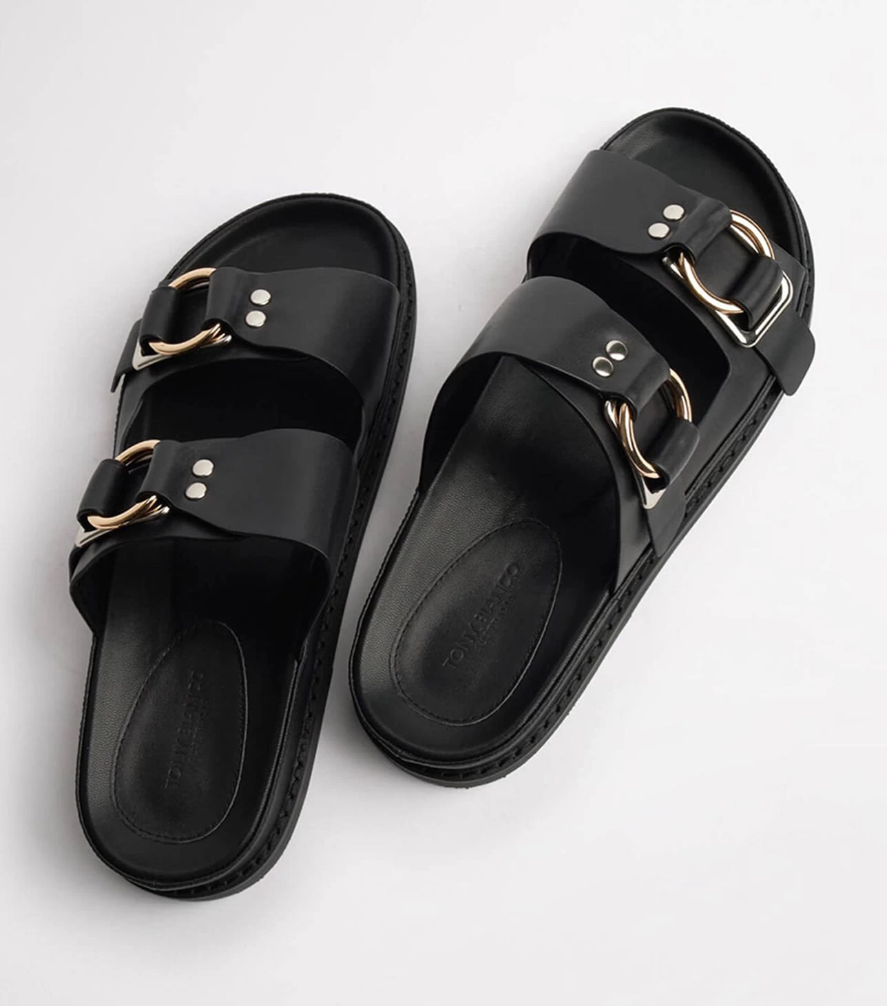 Introducing your new ride or die, Hunter. The flat slides designed for summer-time adventures, around-the-house wear or for a day full of errands – whatever your reason, Hunter has you sorted. Designed with a flat cushioned foot-bed and a thick chunky sole, alongside a round open toe and a flattering two-strap leather upper and all new leather lining. Finished with silver-toned hardware and a gold toned circular ring.
