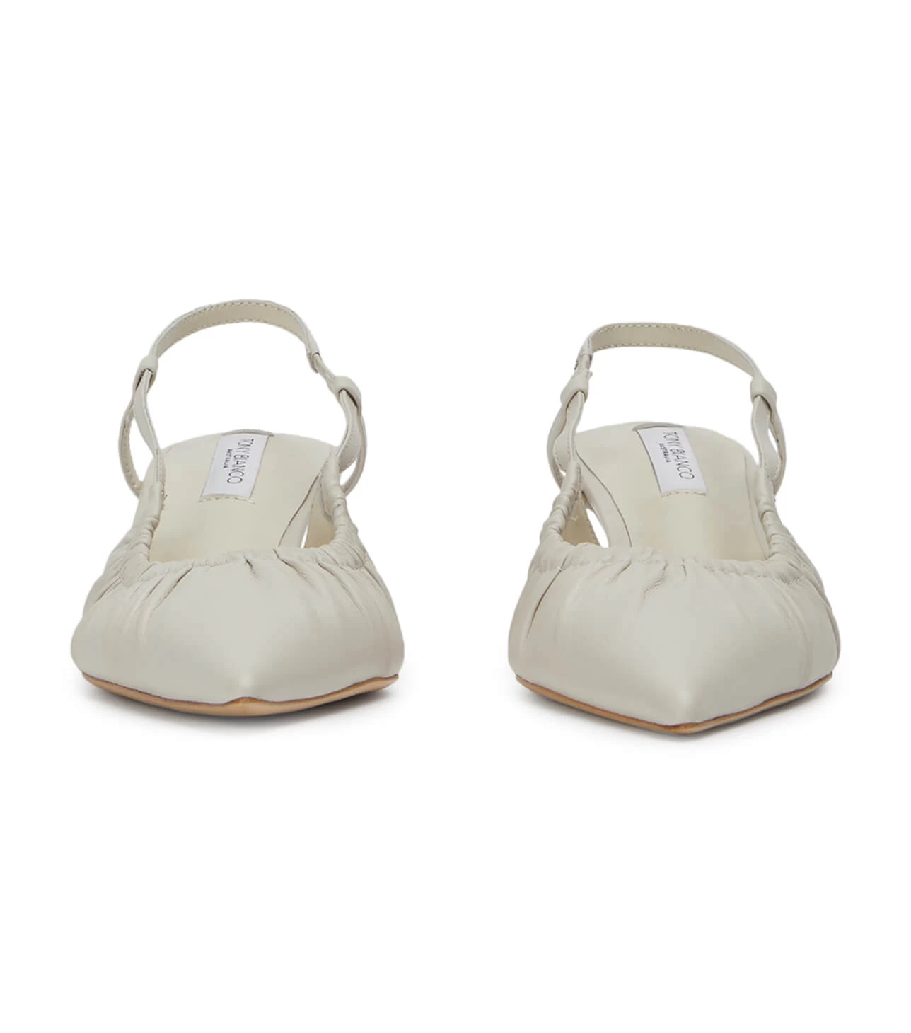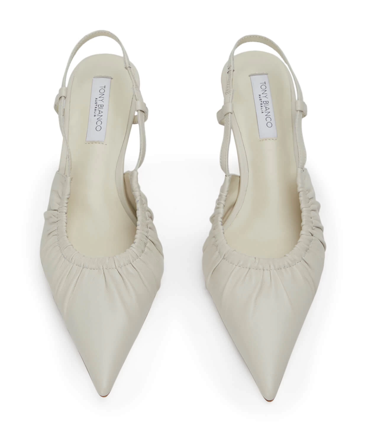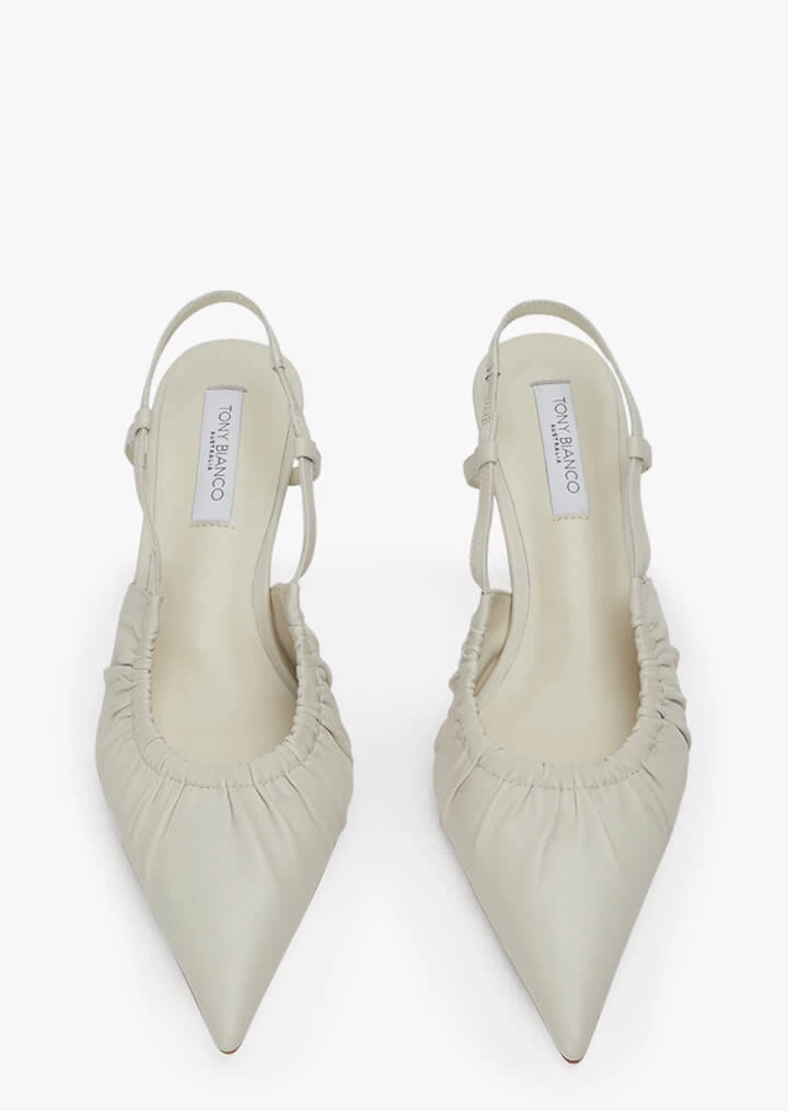 Keep sassy in Kimchi. With a classic silhouette and sling-back, this low heeled pump keeps it fun with a square shaped vamp and scrunch detailing.