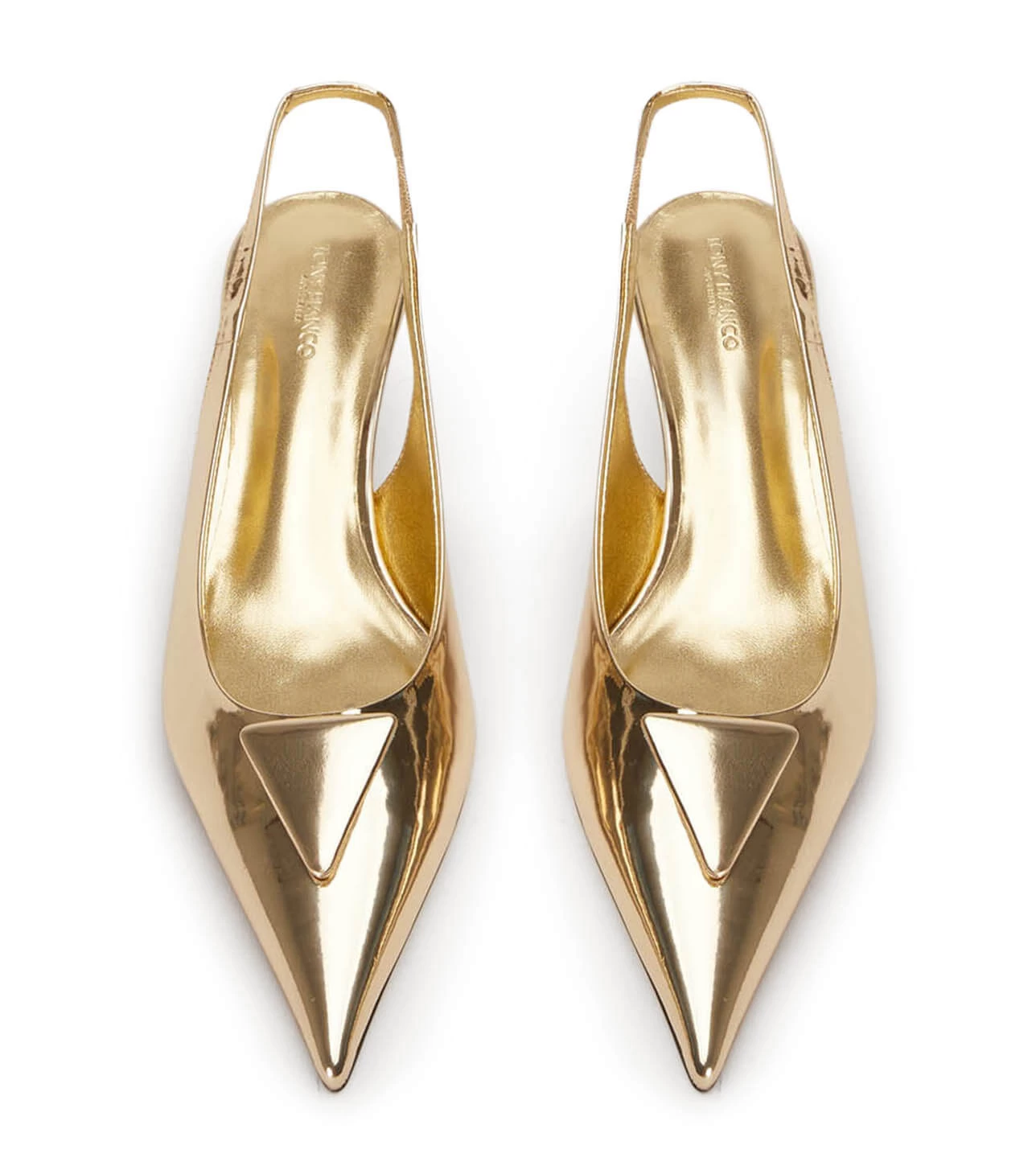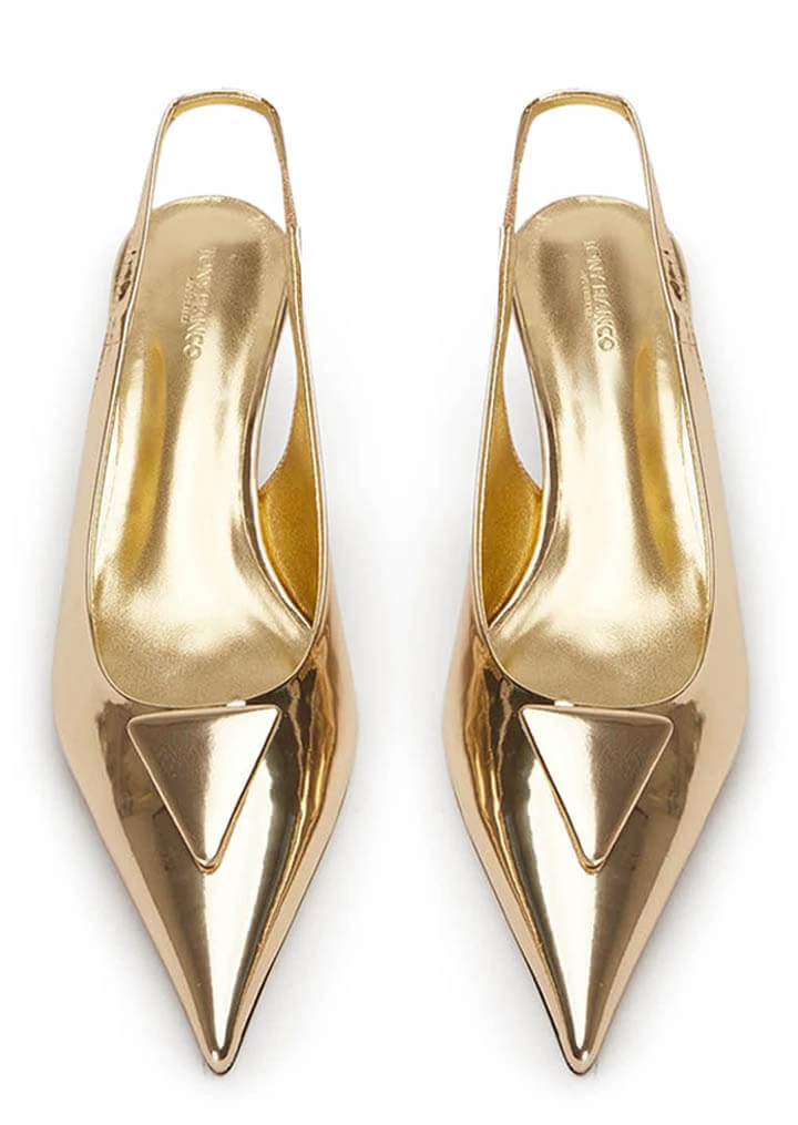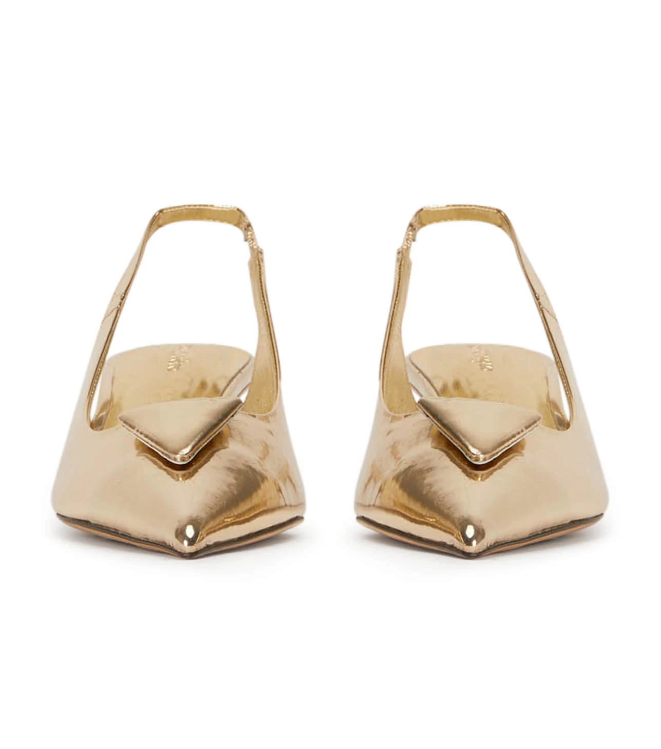 Radiating vintage charm this super low sling-back heel features a sleek, elongated pointed-toe and triangular plaque detailing. Kimmy’s pared back and minimalistic design creates a classic silhouette. Made with our signature gold shine for ultimate style and sophistication.
