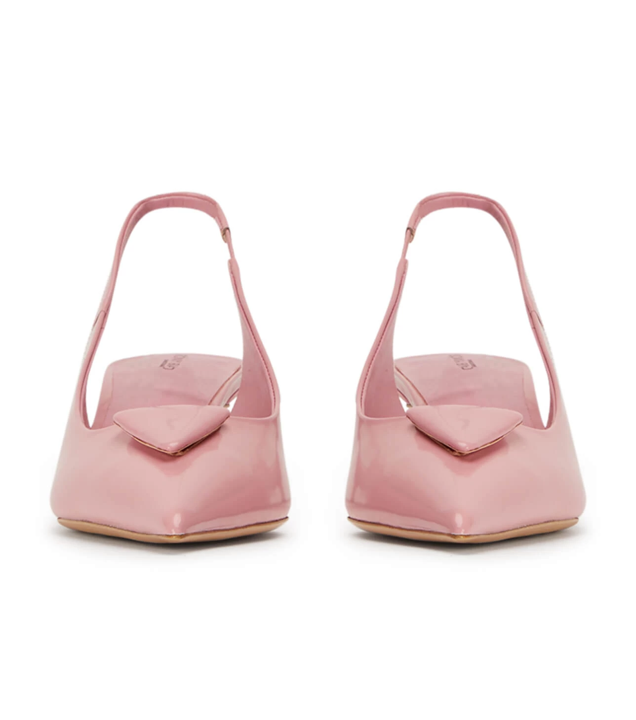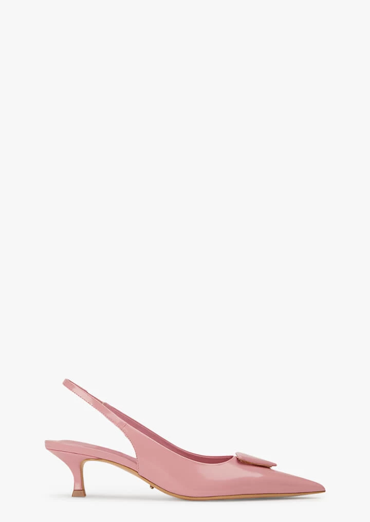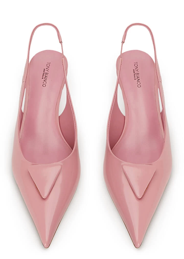 Radiating vintage charm this super low sling-back heel features a sleek, elongated pointed-toe and triangular plaque detailing. Kimmy’s pared back and minimalistic design creates a classic silhouette. Made with our signature musk hi shine leather for ultimate style and sophistication.