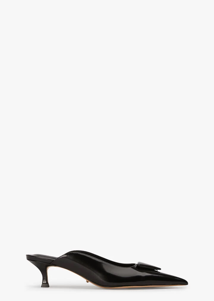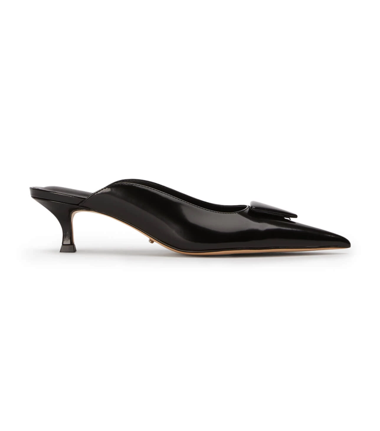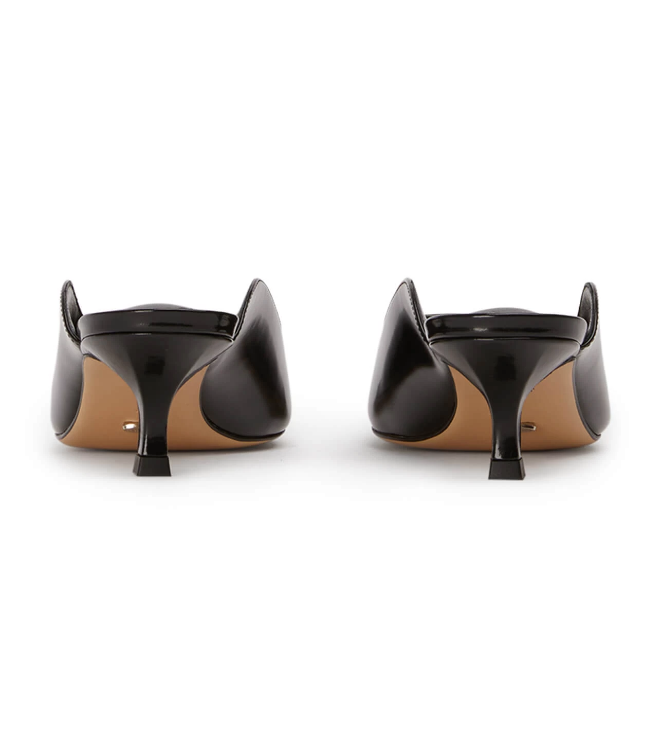Our patent leather pump is further refined this season with a vintage touch. Sophisticated in design, Kira features a triangular plaque, extended pointed toe and open back. For a classic feminine look, pair this low heel with a mid-length pleated skirt or straight leg trouser.