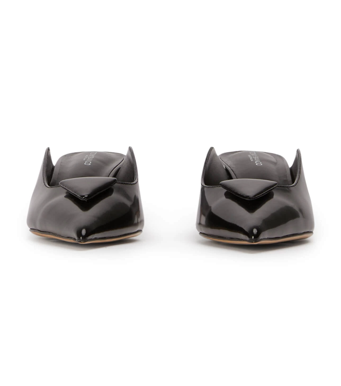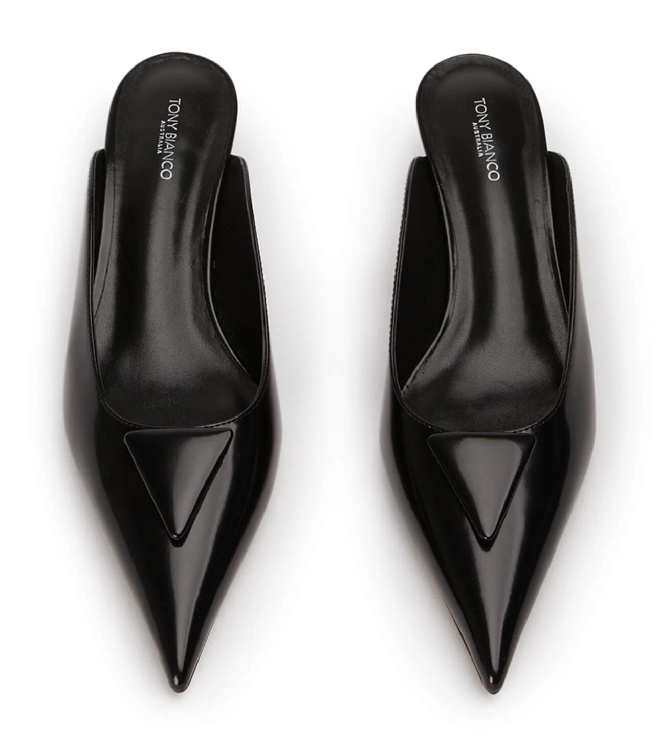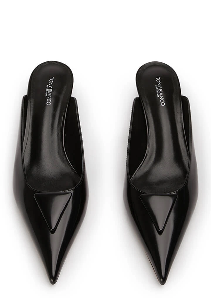 Our patent leather pump is further refined this season with a vintage touch. Sophisticated in design, Kira features a triangular plaque, extended pointed toe and open back. For a classic feminine look, pair this low heel with a mid-length pleated skirt or straight leg trouser.