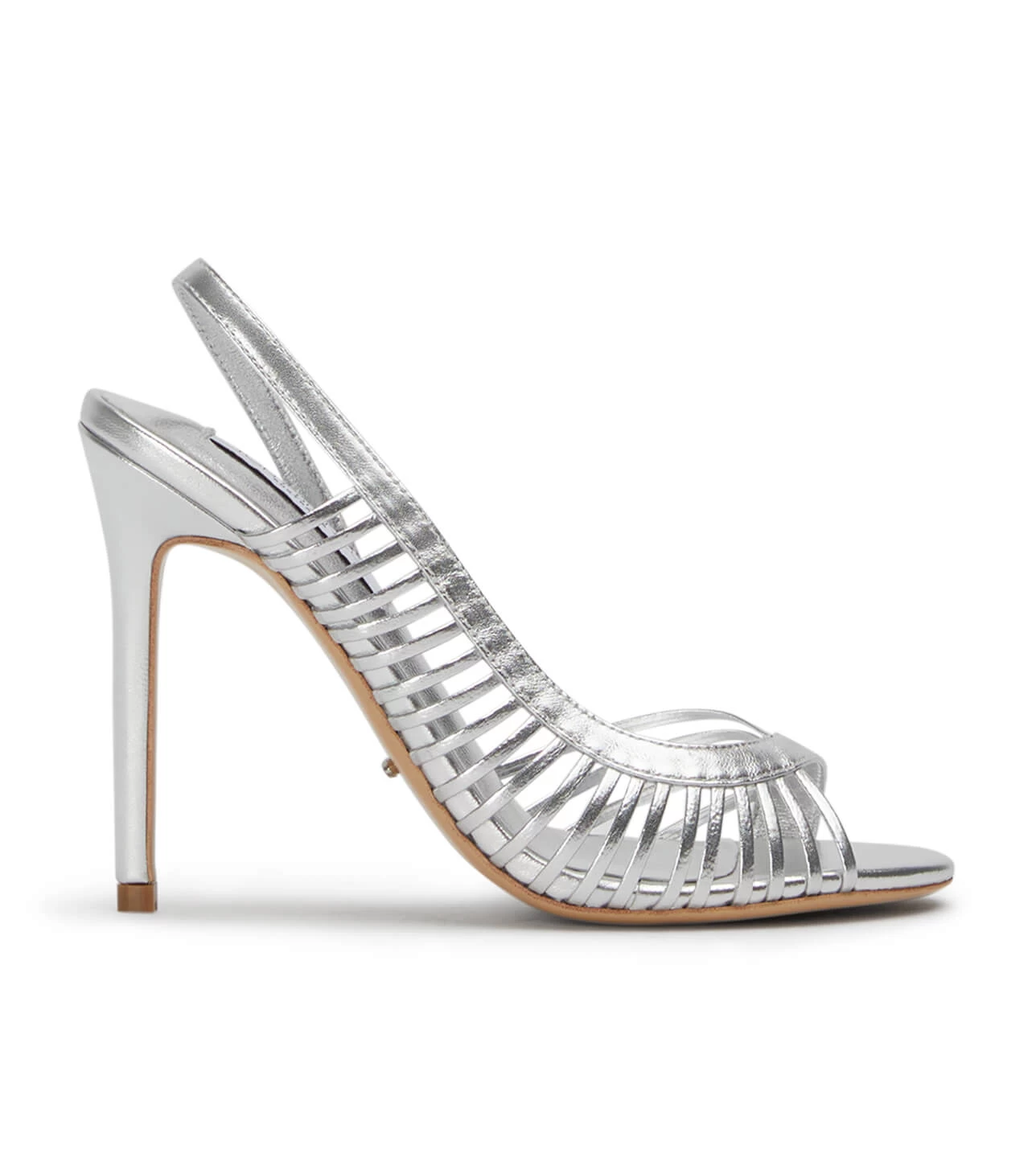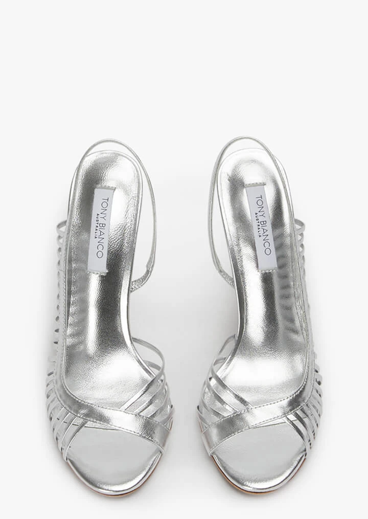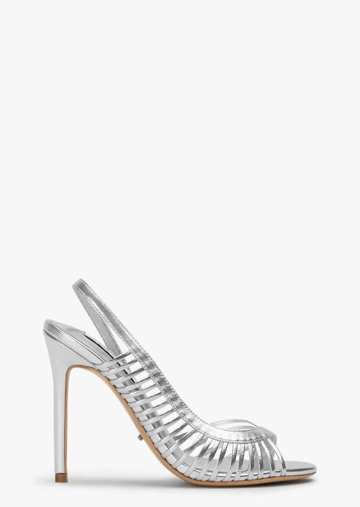 It’s all in the detail rings true for our stiletto heel Klass. This silver metallic heel boasts a sling-back, open rounded toe and curved strap detailing.