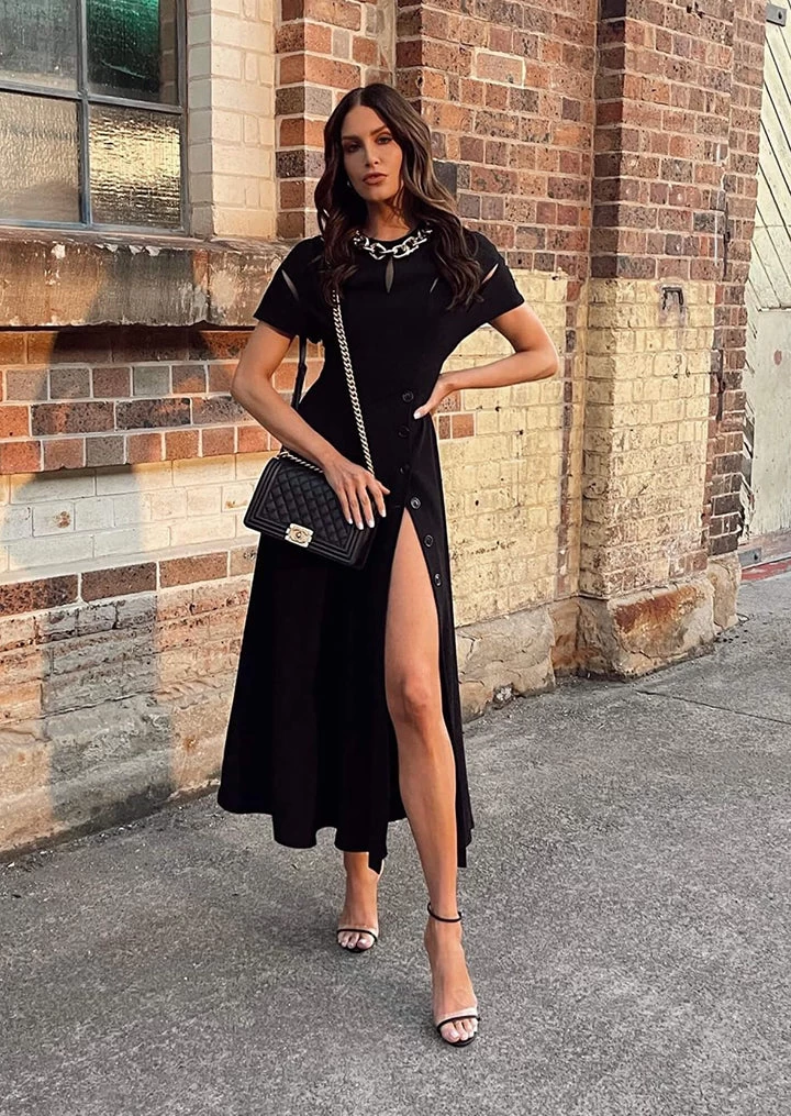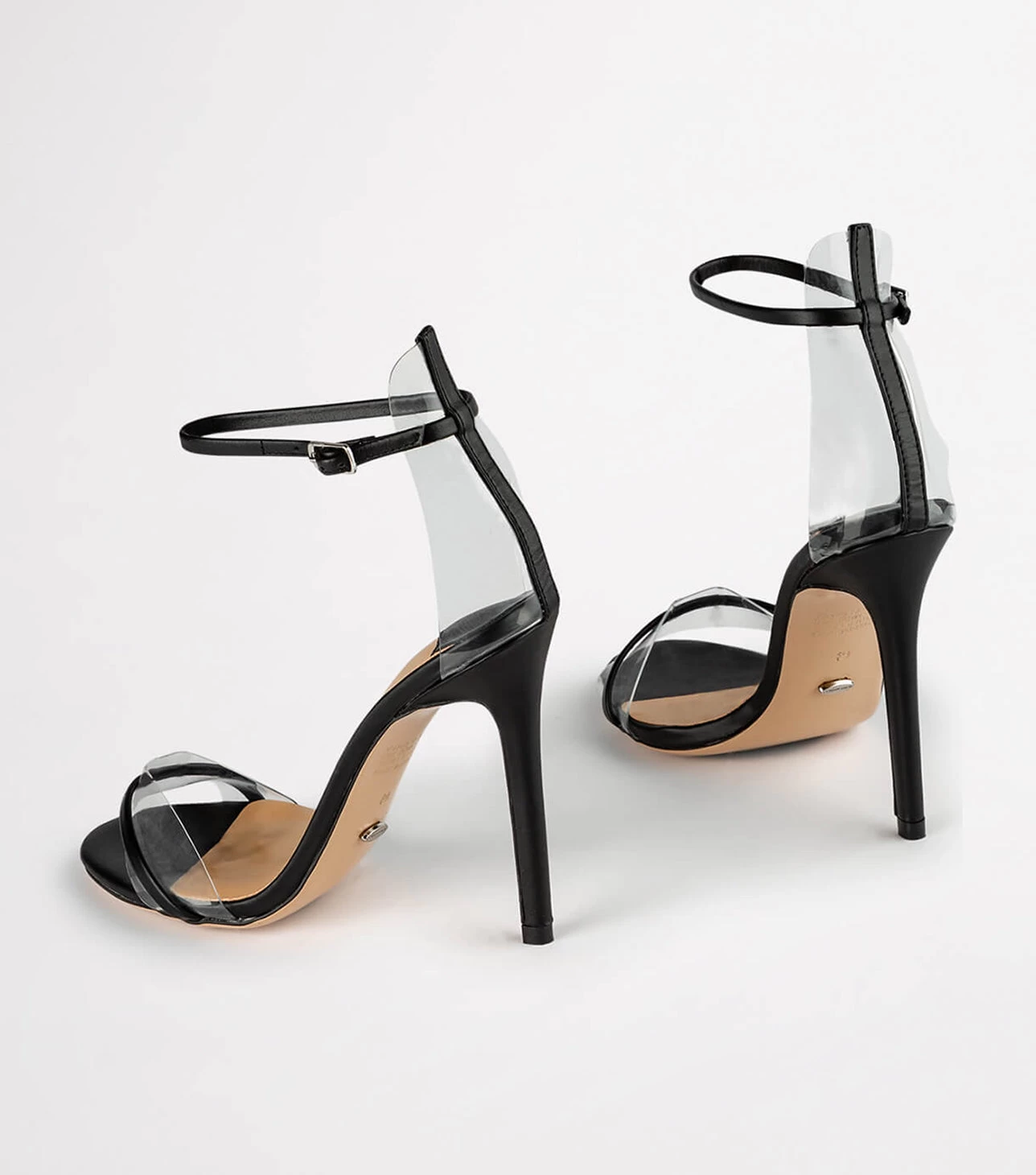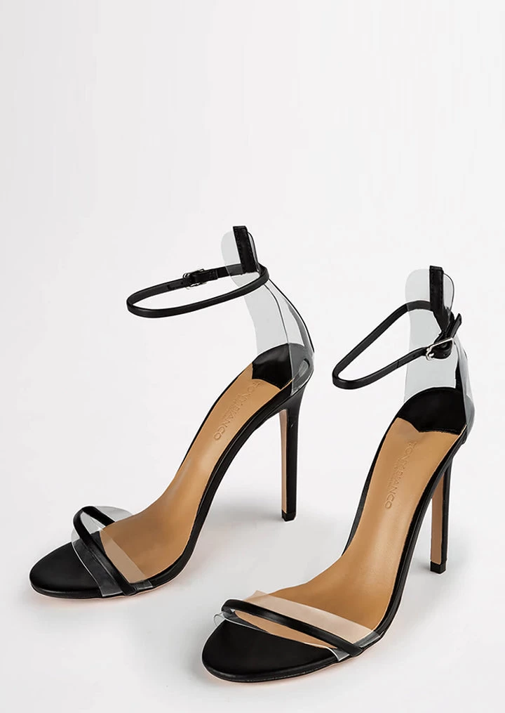 A black leather open toe dress sandal with a stiletto heel with a leather and clear two strap upper. – Combination leather and synthetic upper – Synthetic lining – Stiletto heel – Adjustable ankle strap – Clear feature at front and heel Heel Height: 11cm