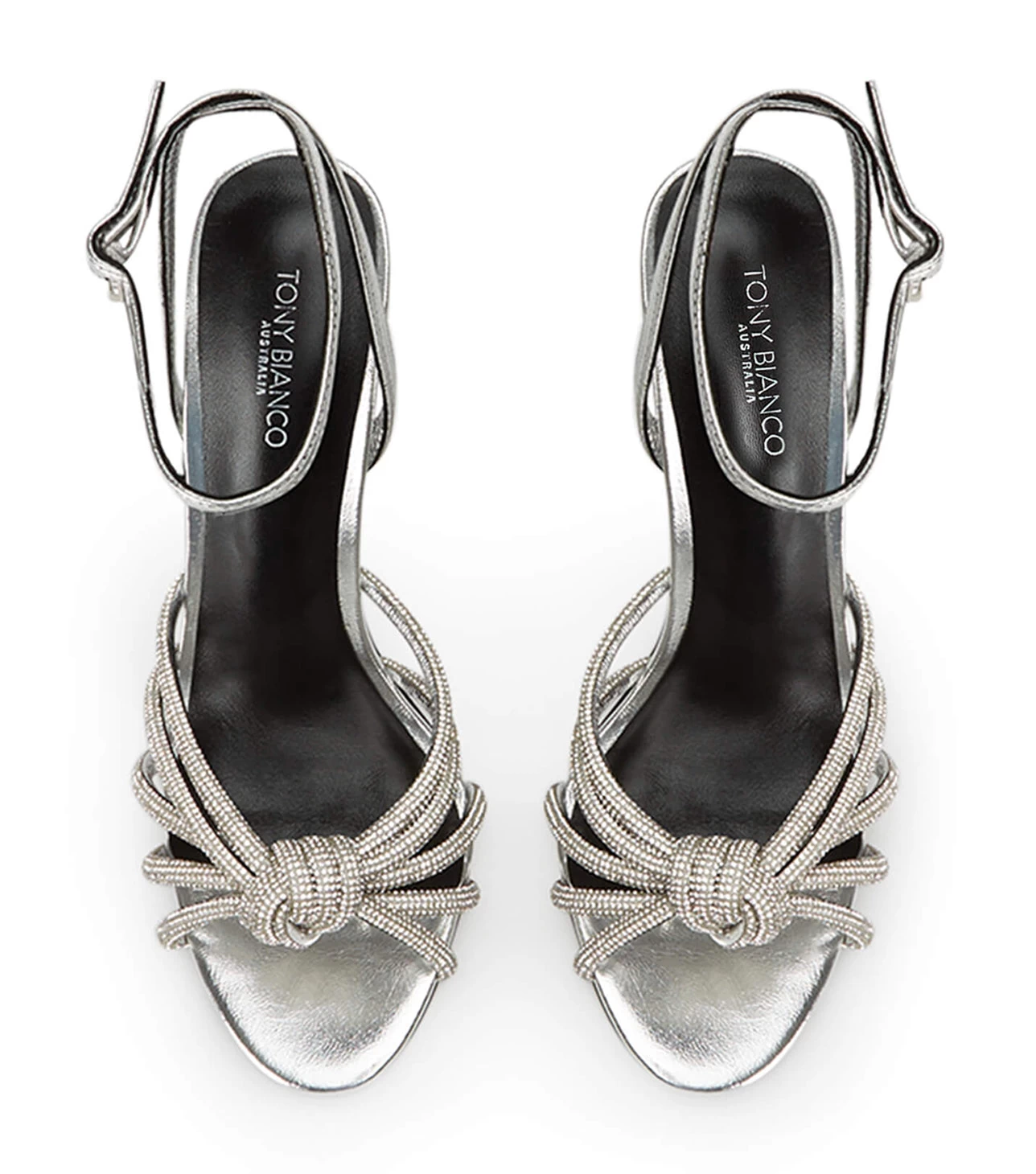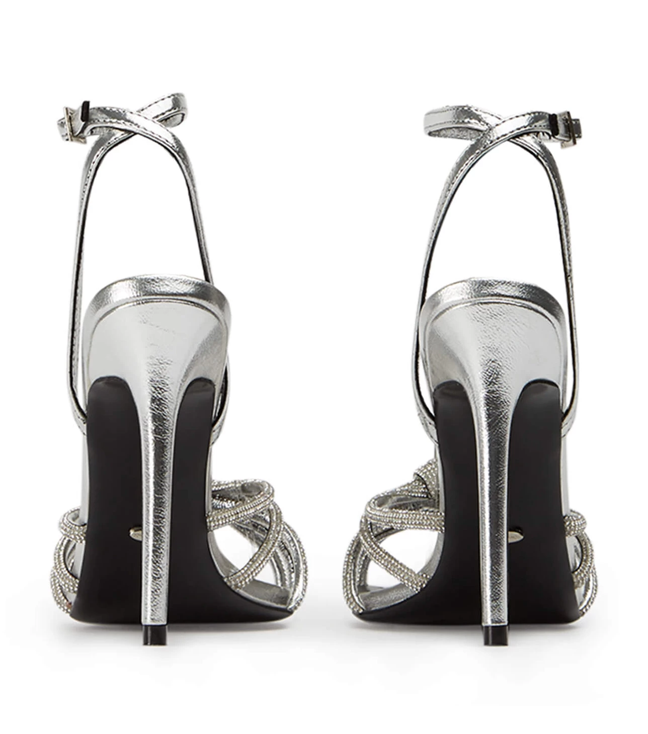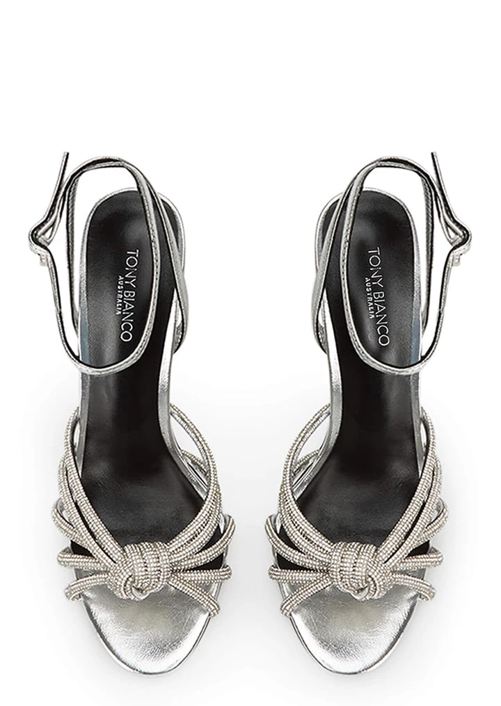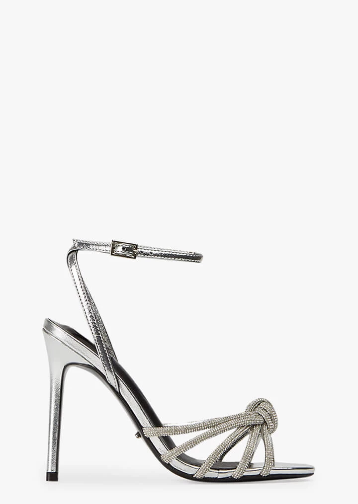 Tie the knot with the embellished Kyla silver metallic stiletto heels. With an interlocking diamante encrusted upper, stiletto heel and barely-there ankle strap, this can be your next bling fling.