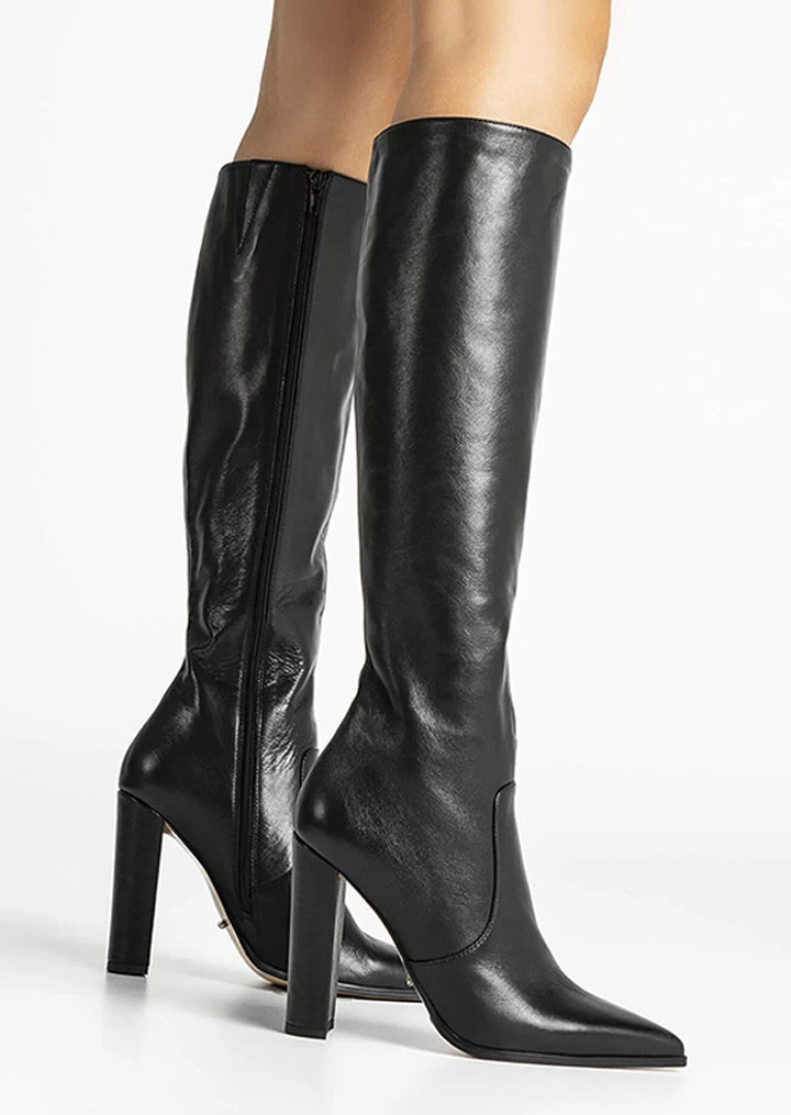 Get ready to fall in love with the subtle slouch of the Lucille boots. Crafted with genuine black leather this stylish knee-high boot features a pointed toe and pairs perfectly with midi dresses or skirts.
