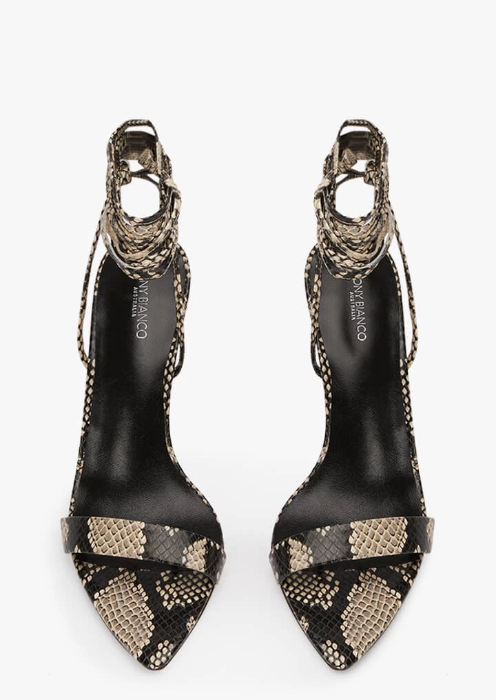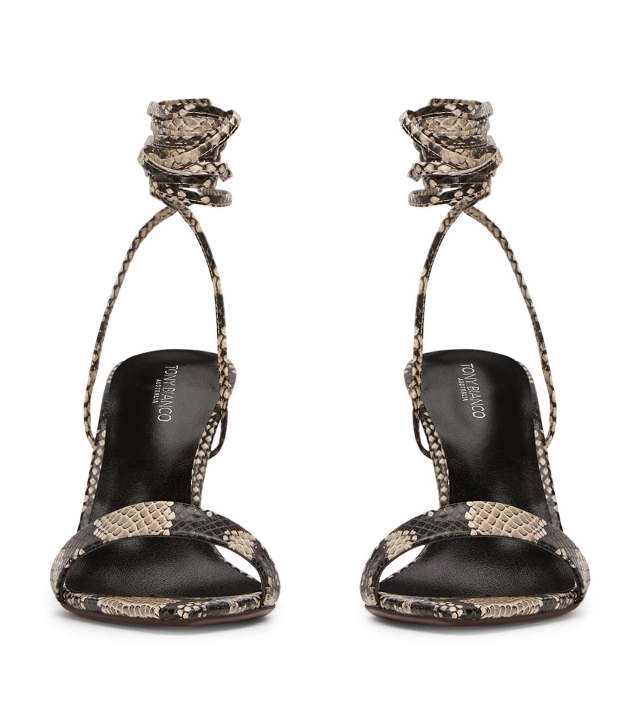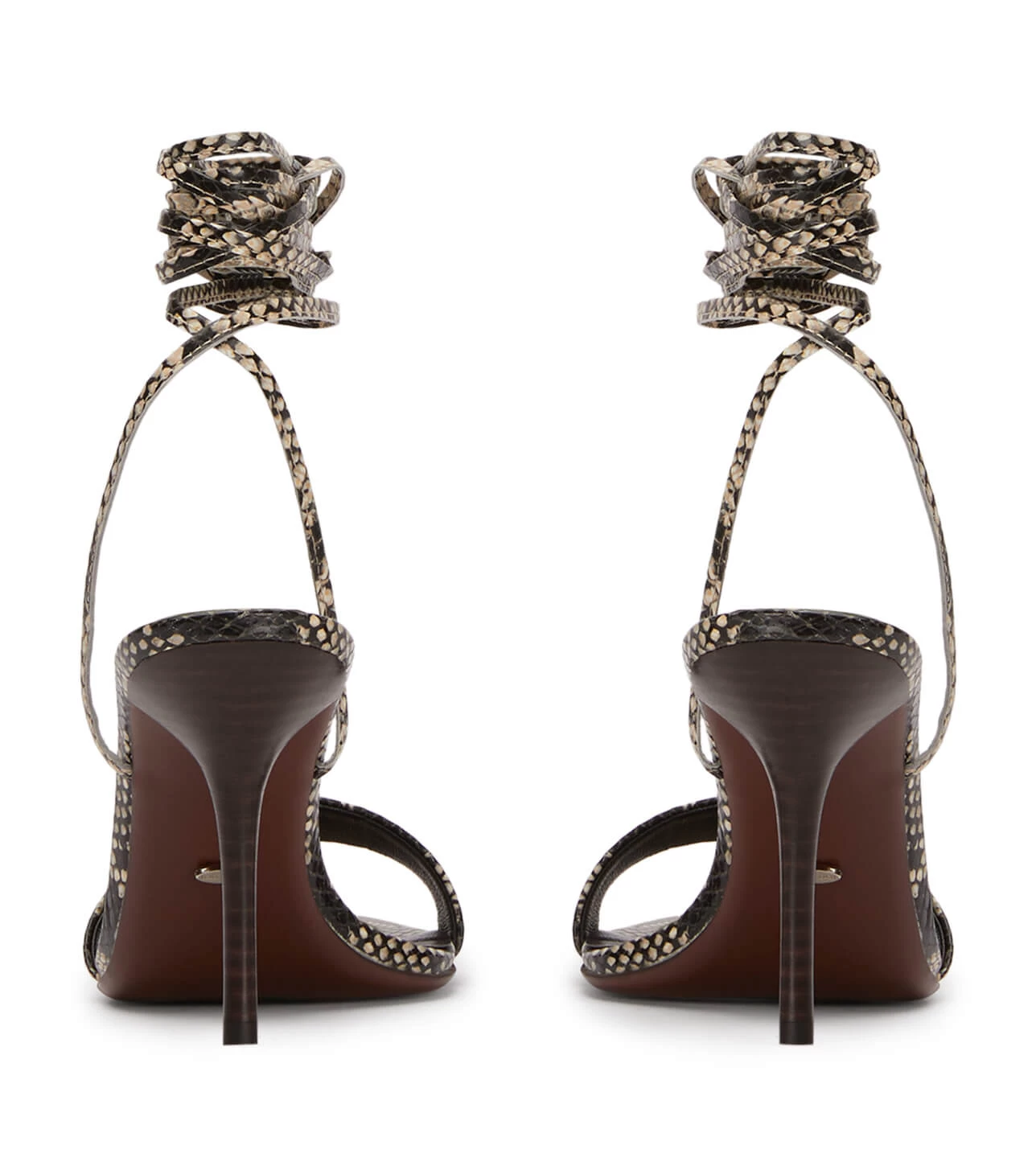 Take a moment for Marvin, our snake print stiletto heel. Sleek and sensuous, Marvin elongates the legs whilst its leg ties allow for versatility.