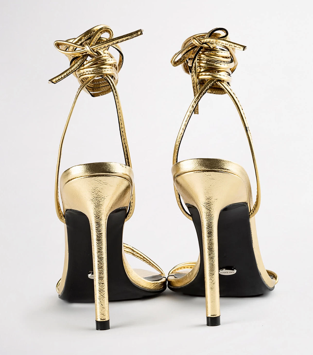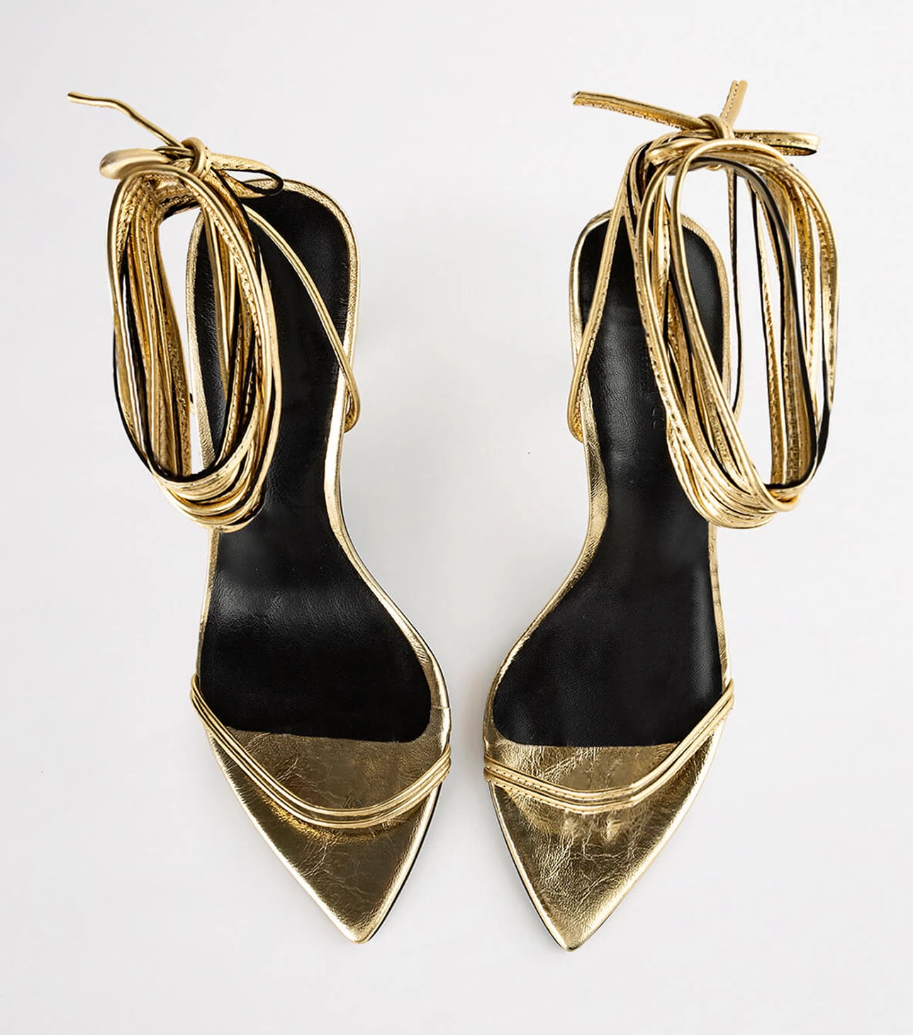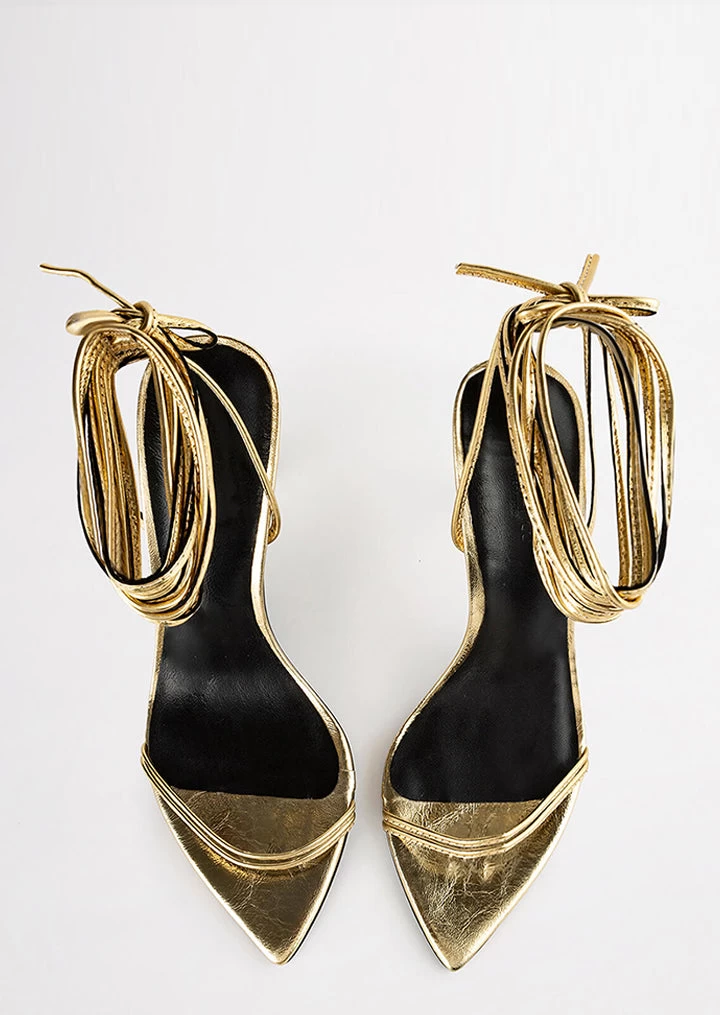 Set yourself up for some serious party vibes with our Millie lace-up strappy heels in gold foil. Showcasing slender straps across the foot and a wrap-around ankle design, this style features a pointed toe-shape and a thin stiletto heel and is finished with a leather upper and quality leather lining.