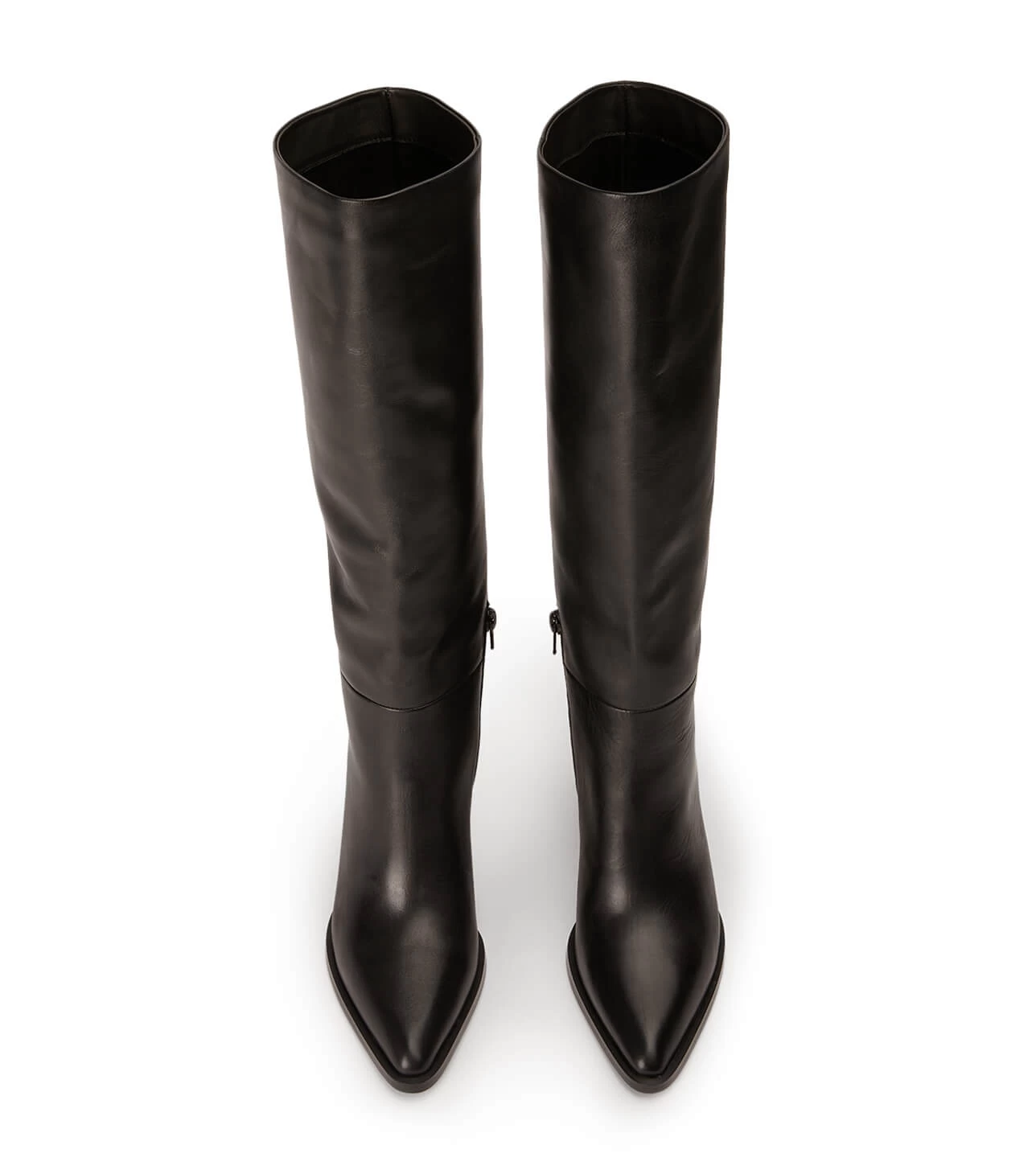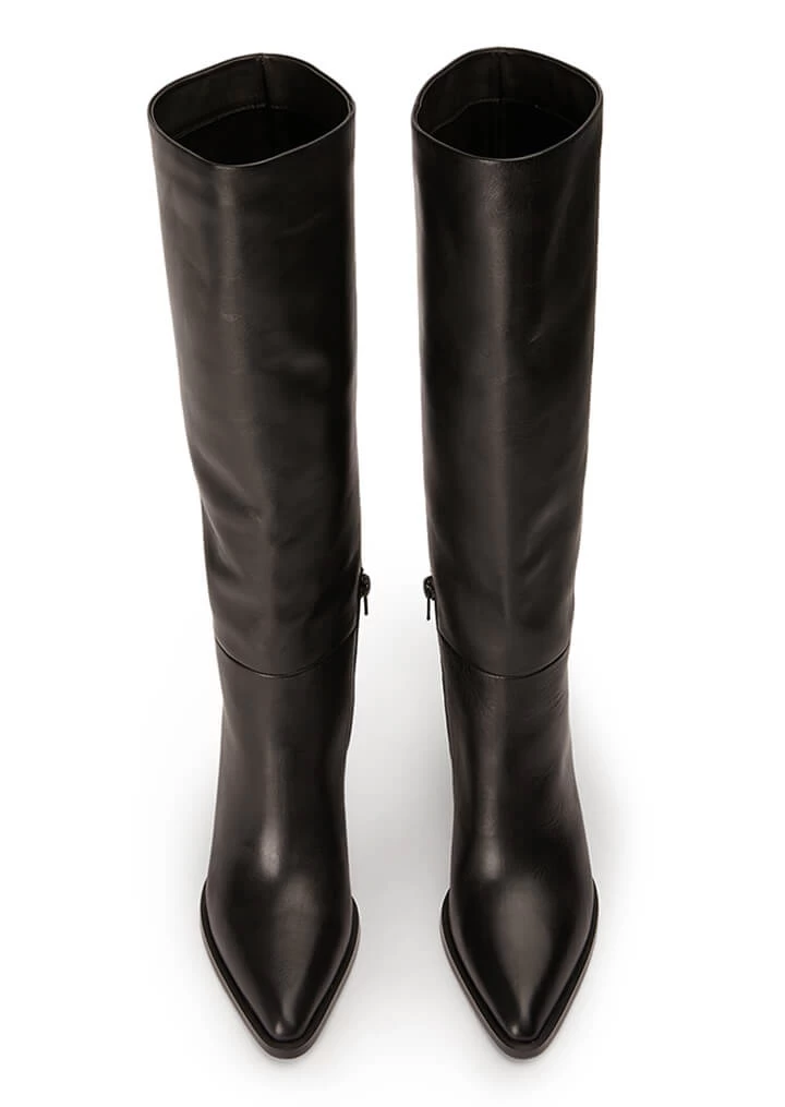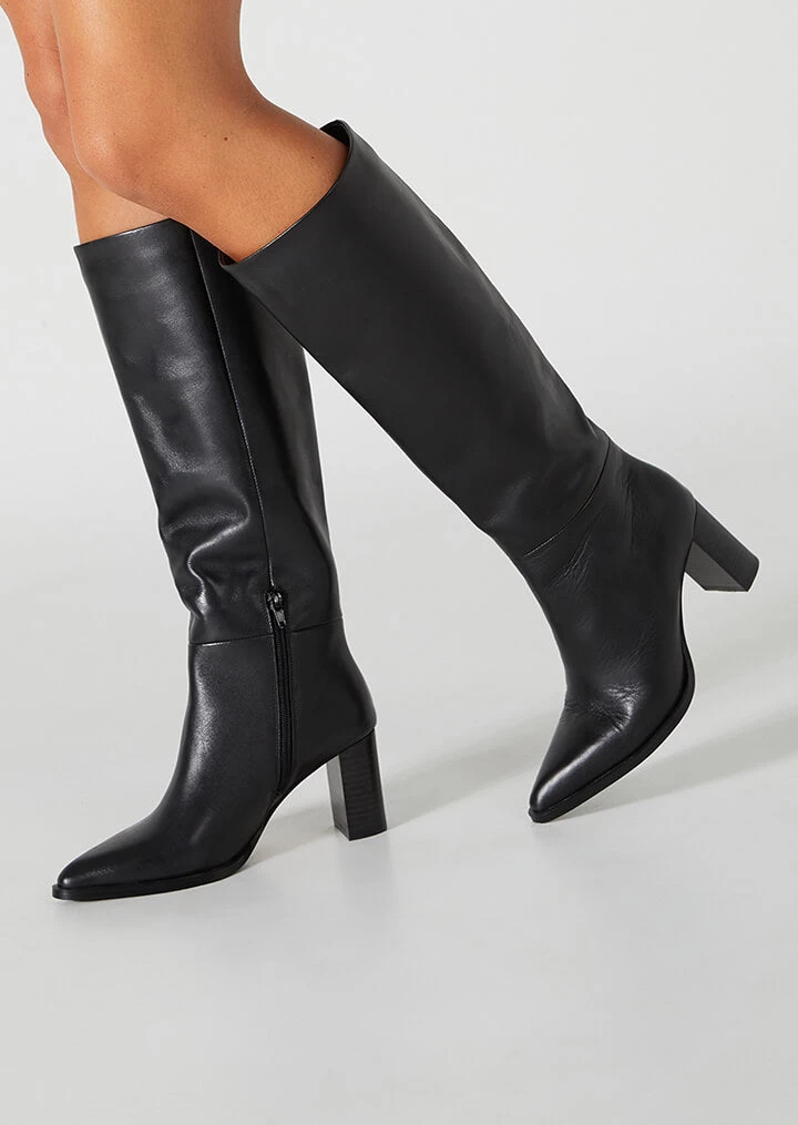 Make an entrance with the Peppe calf boot. Crafted in smooth black leather, featuring a block heel, pointed toe and an inner ankle zip. Say hello to your newest winter essential.