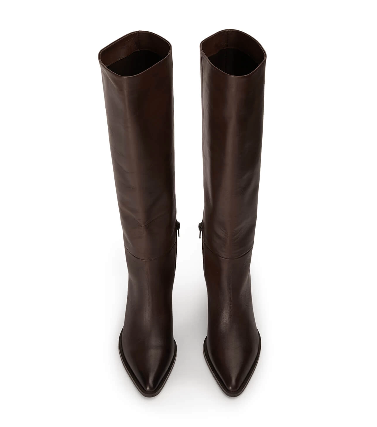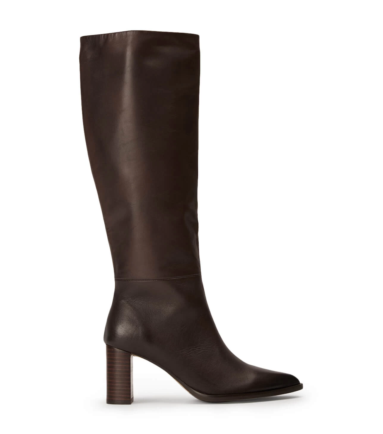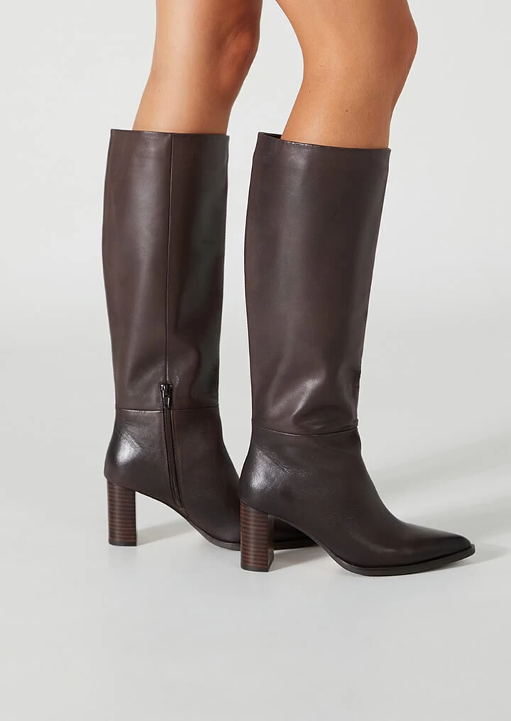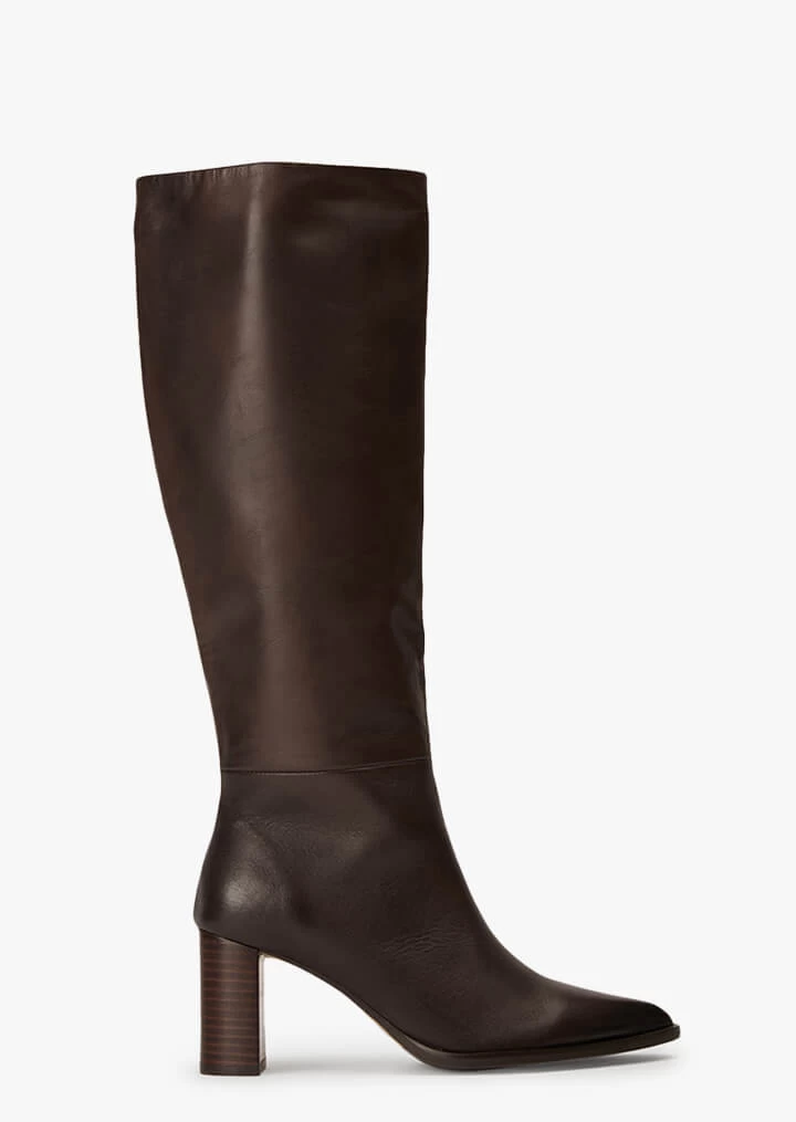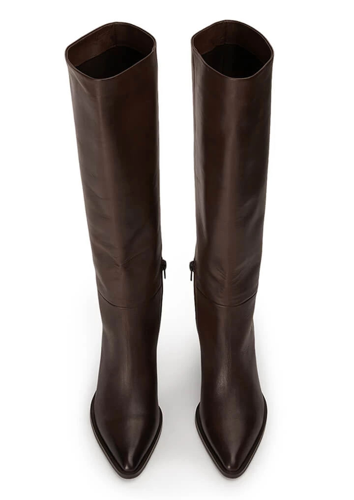 Make an entrance with the Peppe calf boot. Crafted in smooth brown leather, featuring a block heel, pointed toe and an inner ankle zip. Say hello to your newest winter essential.