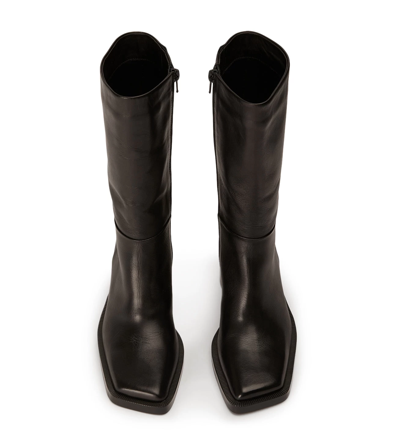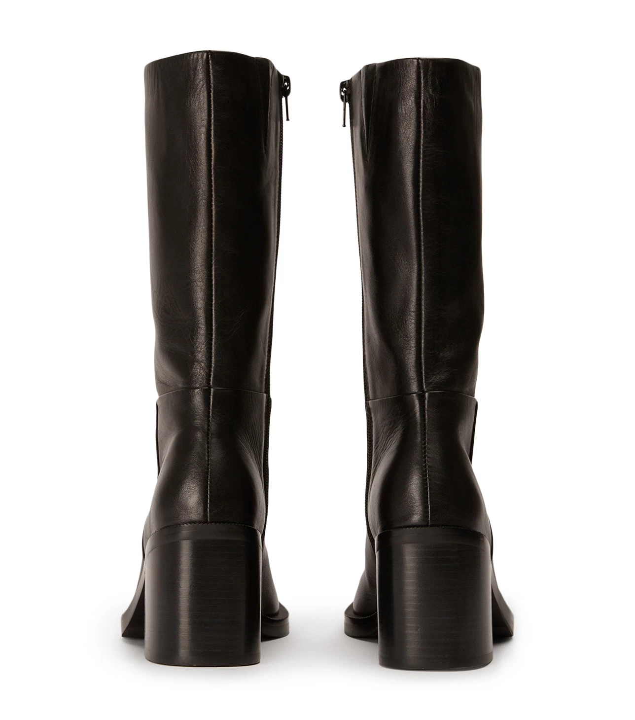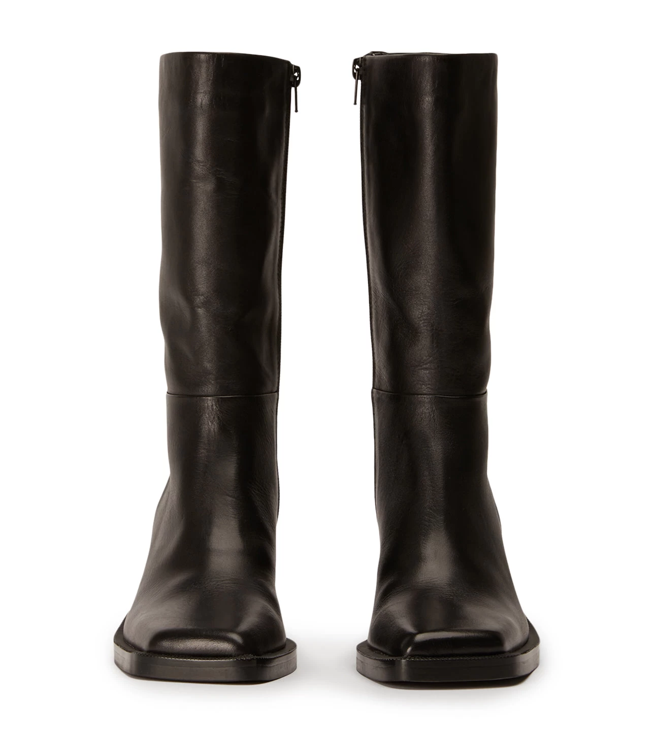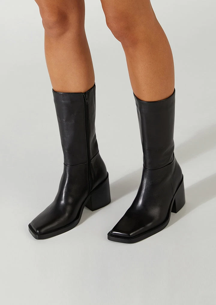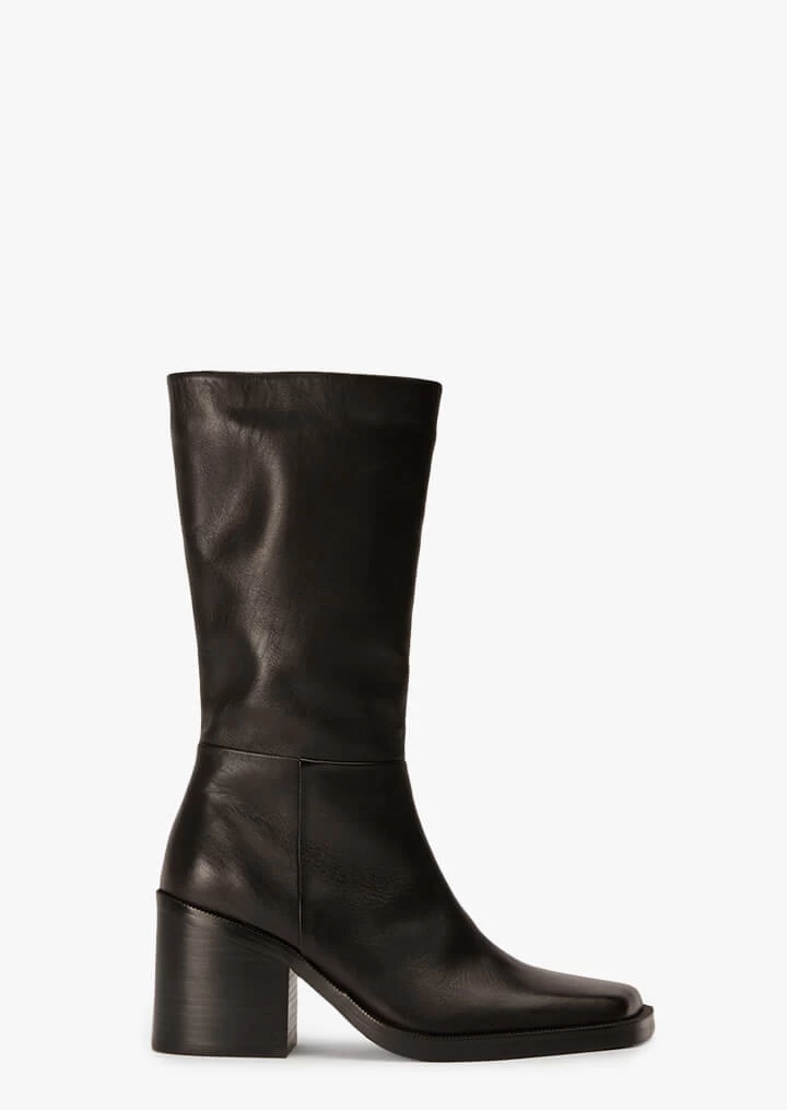 Meet the ultimate cool girl boot,Prestige. With a modern asymmetric squared toe shape and comfortable block heel, this slim fitting calf rise boot perfectly pairs with skirts or dresses for a chic laid back look.