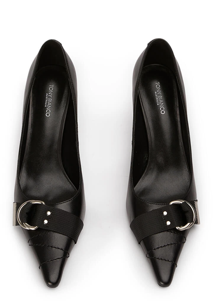 Elevate your pumps collection with Saje. With a pointed toe-shape, this vintage black pump is classy with a modern touch, featuring a D-ring belt buckle, allowing you to make just the right kind of statement.