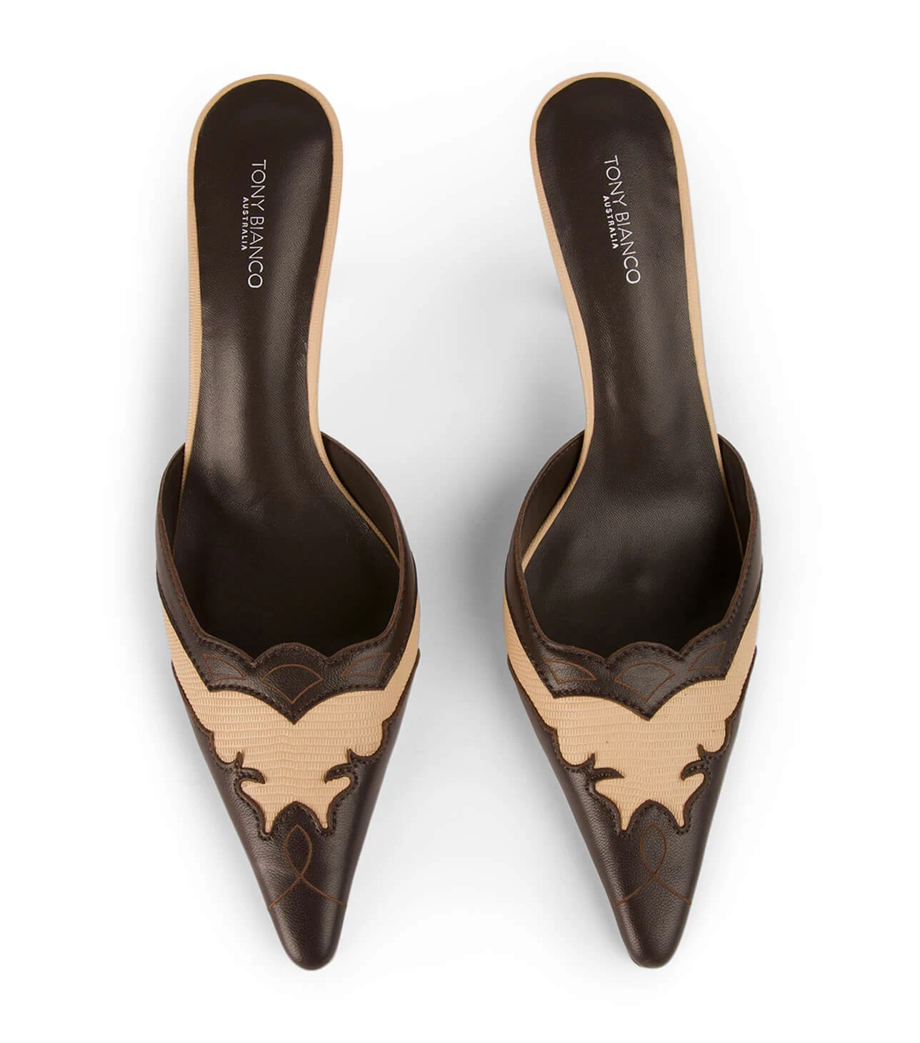 There’s a lot to love about Shuga. With her elegant pointed toe, two-toned patterned leather and open back, Shuga provides elevated western vibes in the form of a vintage pump and perfectly pairs with denim or a simple slim fitting maxi dress.