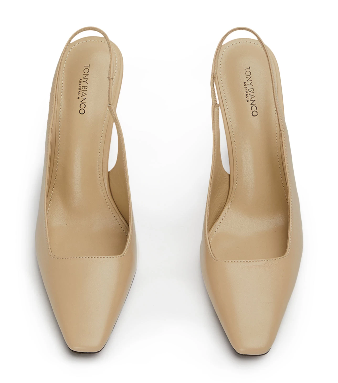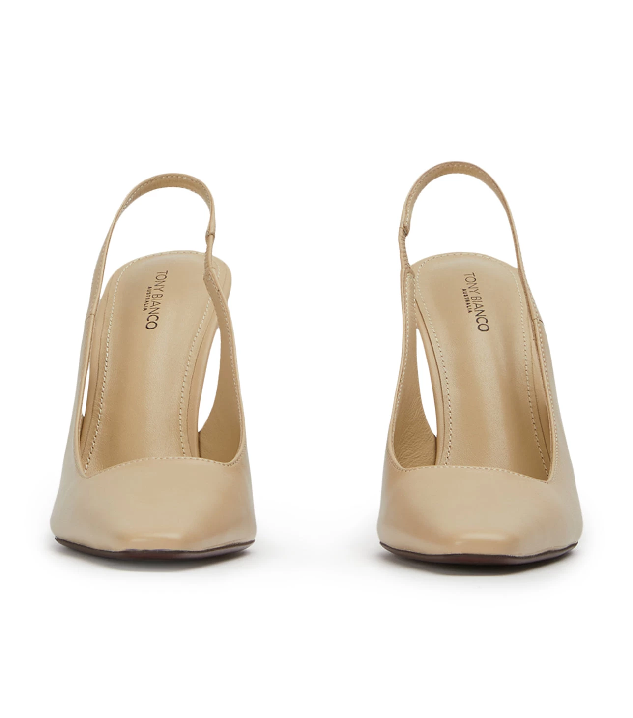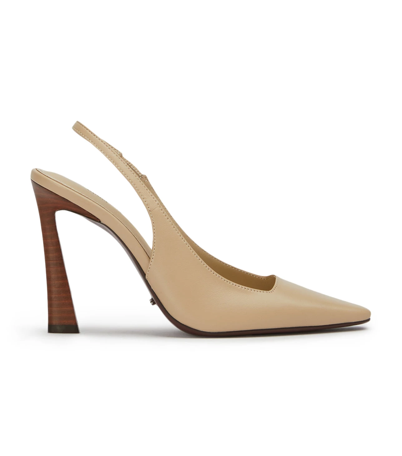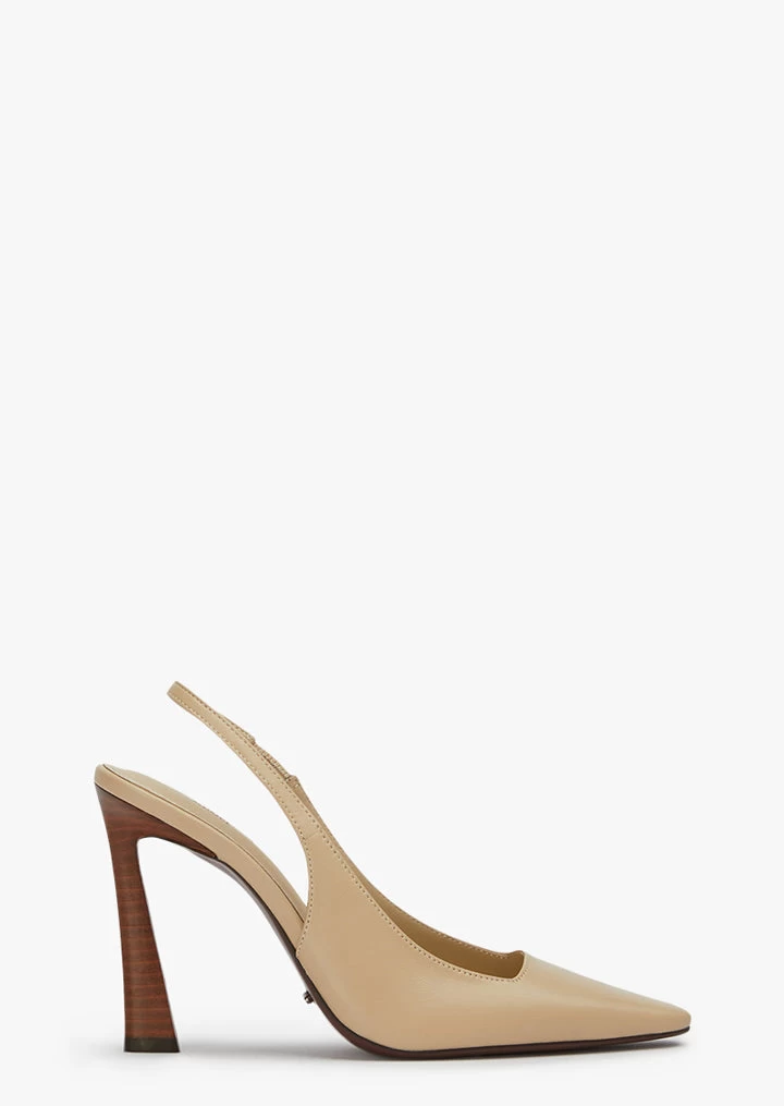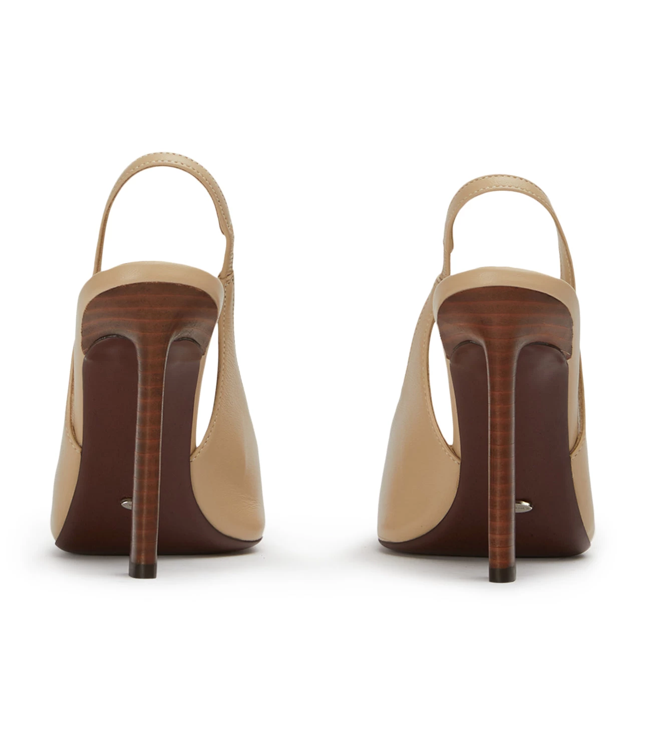 Meet Tiger. Classy and sleek in design, this asymmetric heel emanates sophistication. Curated from our buttery nude leather, this style features a squared off pointed toe and sling-back for support.