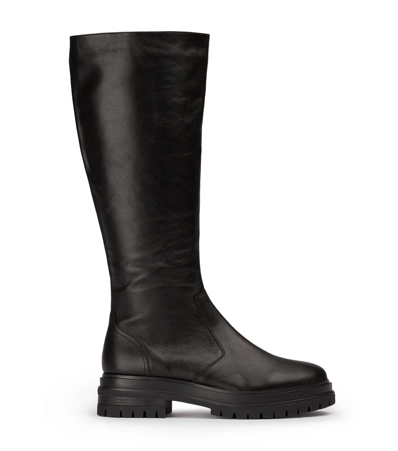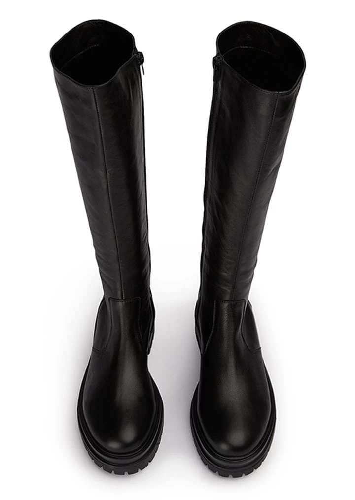 Picture yourself in Wanda, our newest black leather knee high boot. Featuring a chic combat boot aesthetic, this design features a chunky lug sole with a rounded toe-shape and a smooth, genuine leather body.