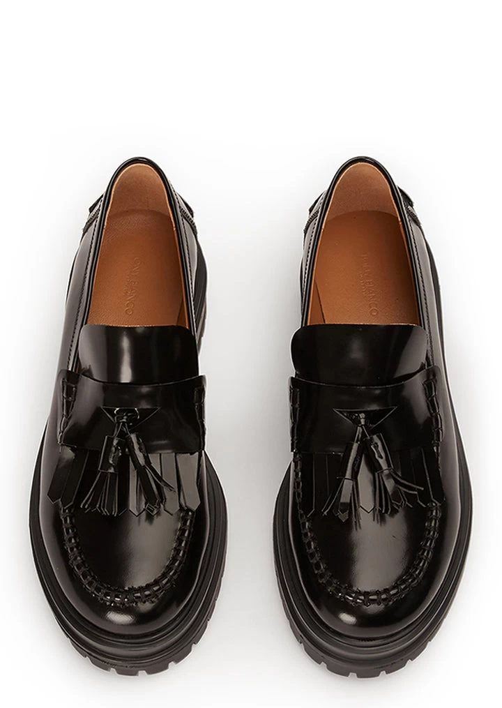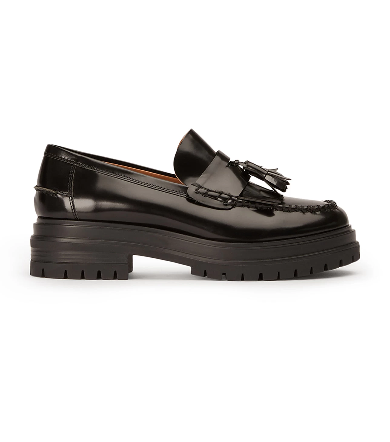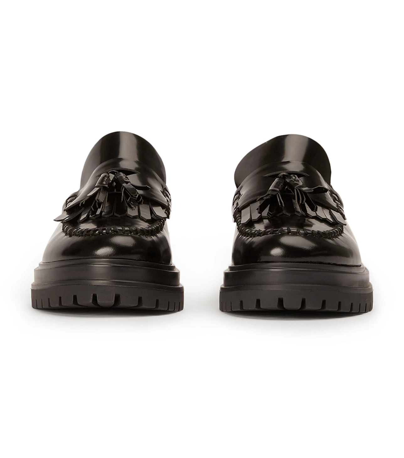 A fresh take on the classic loafer, meet Willow in ultra chic black hi shine. Showcasing a shiny black leather exterior, this design features a chunky sole with a sleek rounded toe-shape, exposed stitching and cute tassel detailing.