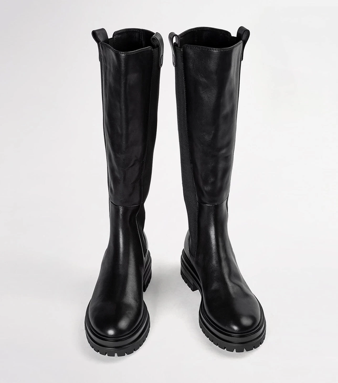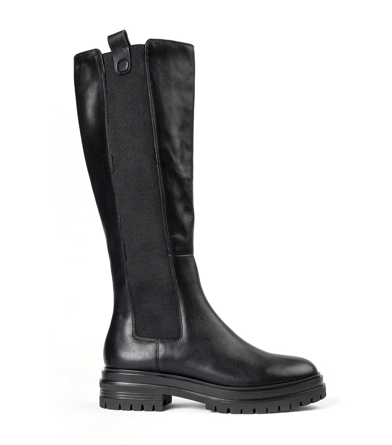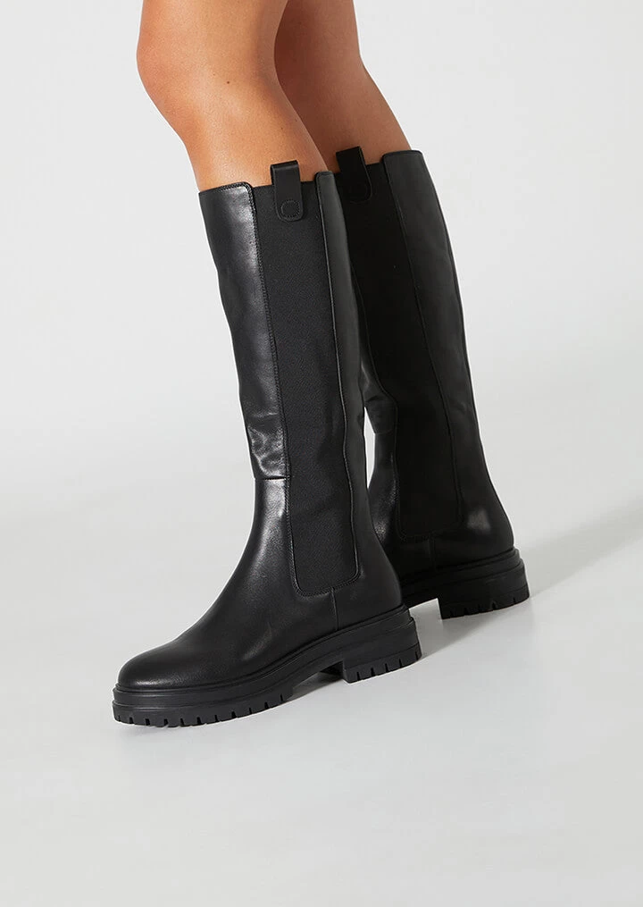 You can expect nothing but the best from our Winx knee-high black boot. Made with a premium leather upper and lining, this design features an inner elasticised panel, a comfortable rounded toe-shape, a top leather pull tab and a subtly slouched fit. Finished with a chunky exposed sole and a cushioned foot-bed for maximum comfort.